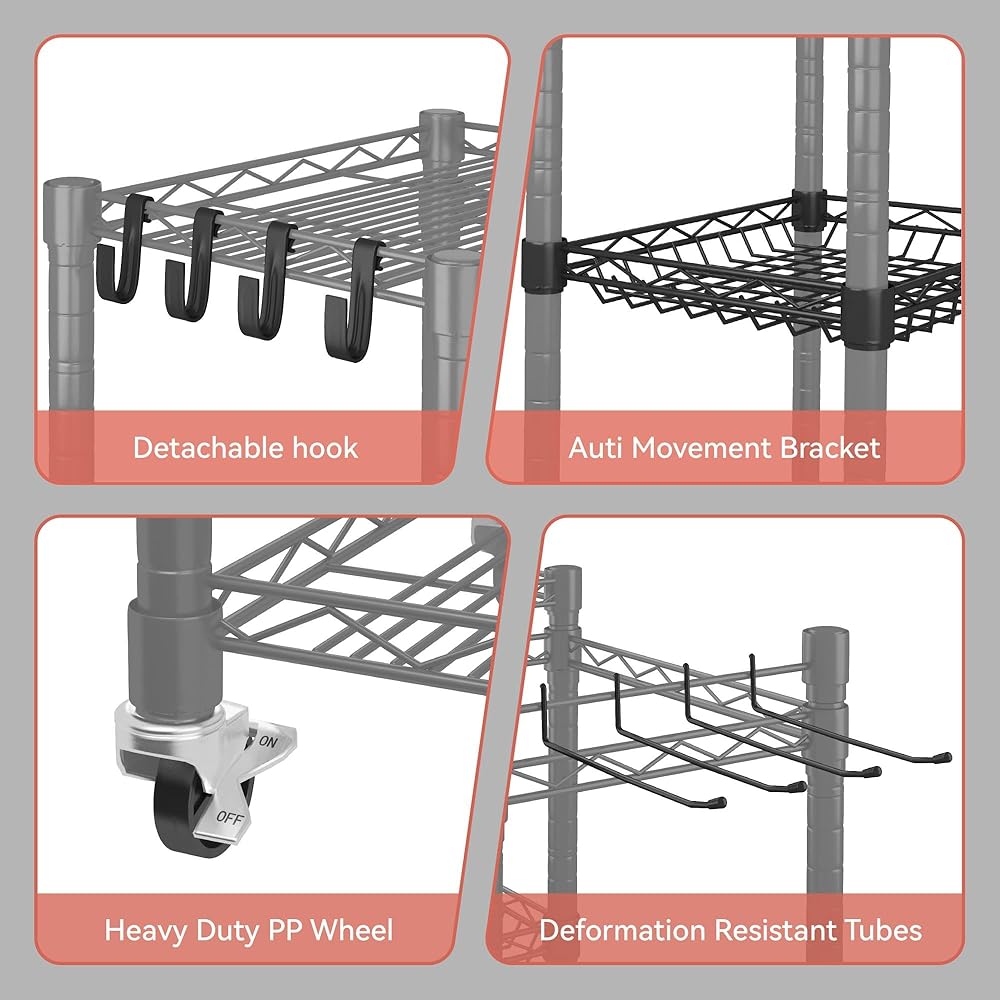【أرفف قابلة للتعديل ونظام عجلات قابل للقفل】 نظام العجلات المبتكر يسمح بسهولة تحديد موضع الرف وقفله في مكانه، مما يضمن الثبات والسلامة. يمكن تعديل موضع أرفف التخزين، مما يتيح لك تغيير ارتفاع الرف وموضعه حسب الحاجة.