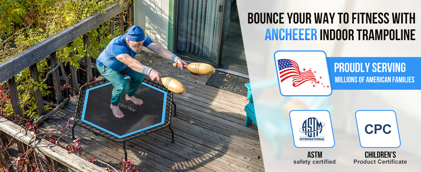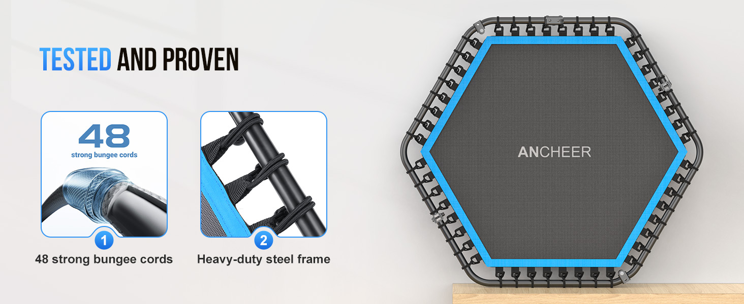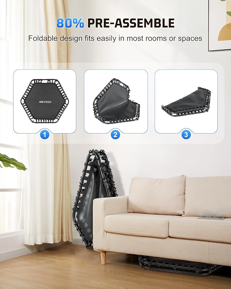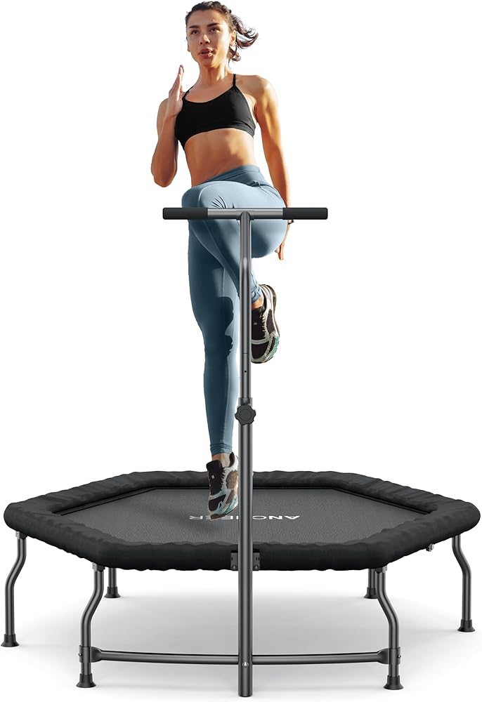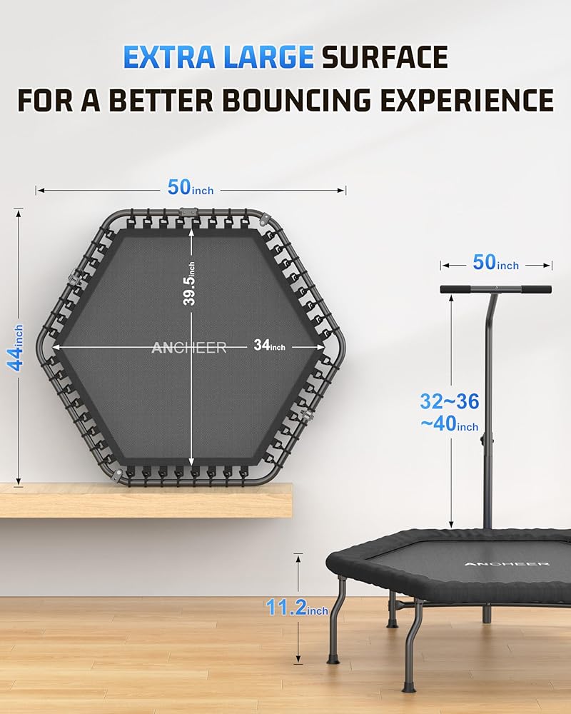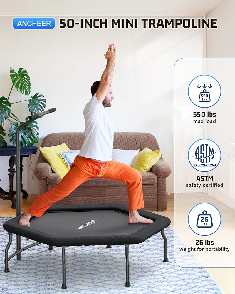 ترامبولين صغير للبالغين، ترامبولين داخلي مقاس 50 بوصة للبالغين بوزن 550 رطل. ترامبولين بدون زنبرك من ماكس لود للبالغين مع شريط مقبض قابل للتعديل بثلاثة مستويات