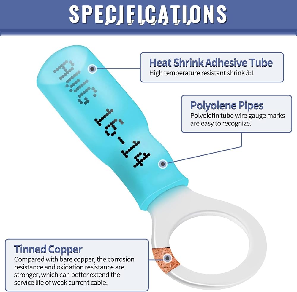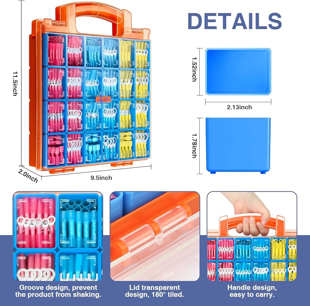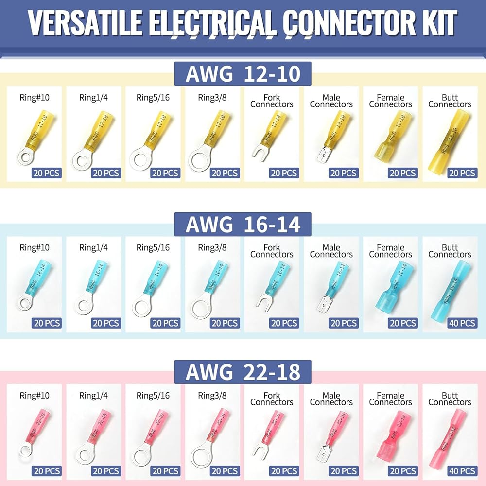 موصل سلك من الدرجة البحرية: تتضمن مجموعة الموصلات الكهربائية Sopoby AWG16-14 22-18 12-10 3 أنواع قياس، 3 ألوان 8 أحجام وصلات شوكة حلقية معزولة مجعدة، مما يجعل توصيل السلك أسهل