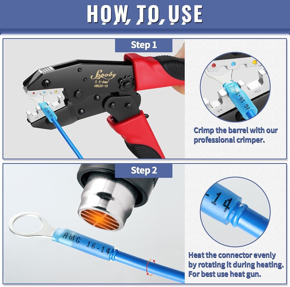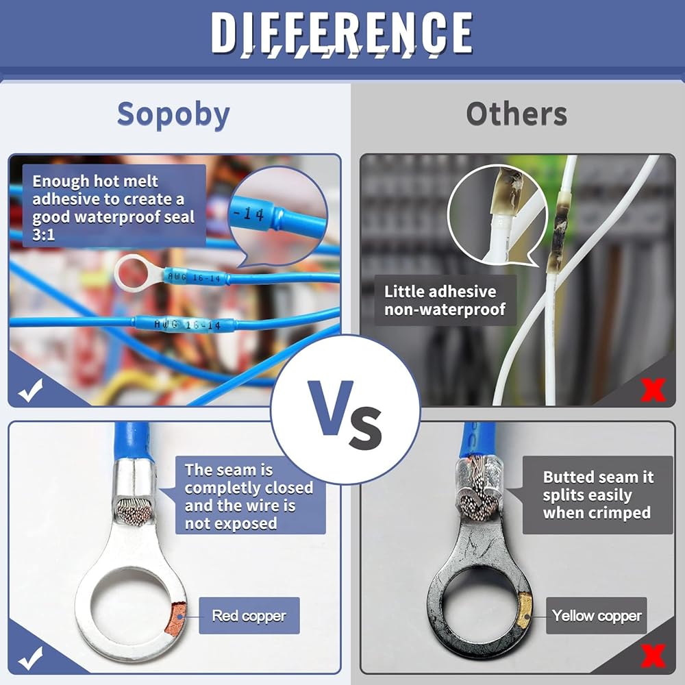 520 قطعة من موصلات الأسلاك المنكمشة بالحرارة من الدرجة البحرية من Sopoby - مجموعة موصلات كهربائية من النحاس الأحمر المعلب، AWG 22-10 موصلات مجعدة مقاومة للماء ووصلات معزولة على شكل حلقة شوكة