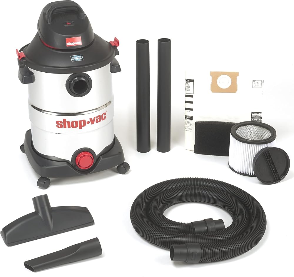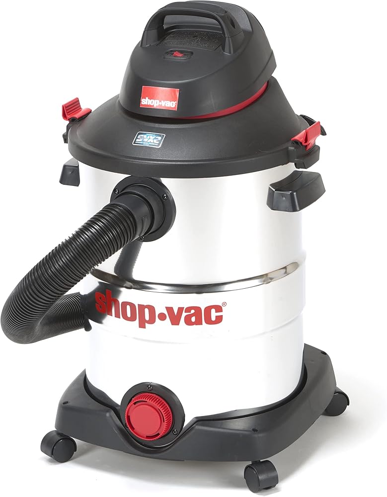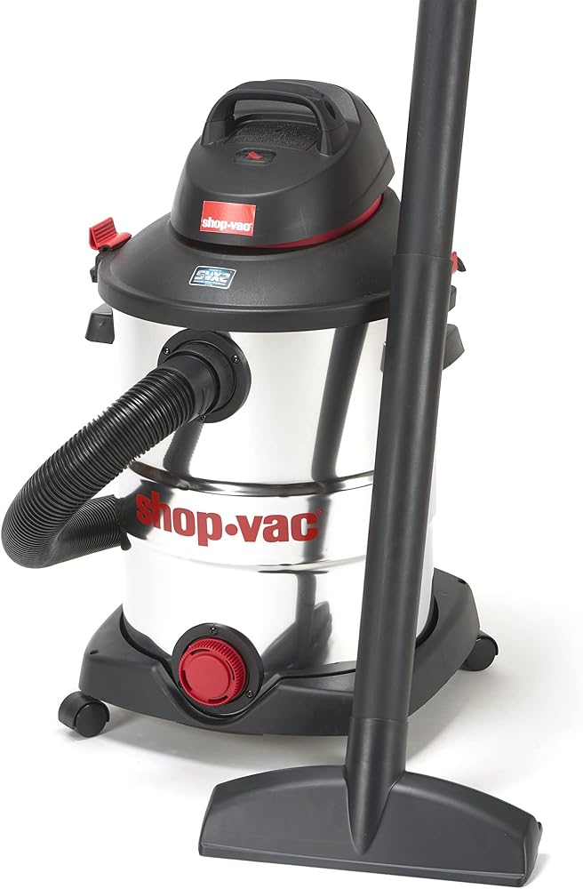 Getting tired of all the brushing, blowing, dusting and sweeping at the end of your jobs and projects? If you have a mess to clean up, this powerful performing wet/dry vac can get those messes cleaned up for you a lot faster than the manual-labor ways. The Shop-Vac 12 Gallon 5.5 Peak HP Stainless Steel Wet/Dry Vacuum features a durable, easy to clean, stainless steel tank. This vacuum provides you with powerful cleaning for picking up wet or dry messes in your garage, workshop or basement, and more. It is fully loaded with most preferred features, accessories and vacuum filters, and features an onboard accessory storage compartment, an 18 foot power cord with onboard cord storage, easy roll casters, and an efficient filtration system that is superb for suctioning, collecting and retaining small particles and debris. Included with this Shop-Vac system is an 8-foot long 2-1/2 inch diameter hose, 2 extension wands, a crevice tool, and a 14 inch wet/dry nozzle. Get full power performance when using the cartridge filter, the disposable filter bag, or the foam sleeve (for liquid pickup) to clean up your work's waste and debris at the end of each work day. The features and accessories of this wet/dry vac were designed to match the demands of everyday cleaning around the house and in the garage, and its 5.5 peak horsepower motor is geared to handle any type of cleaning mess your tools and machinery can put out. Attach the hose to the rear blower port to blow dirt out of those hard to reach places or grass clippings from your sidewalk. Other accessories that can also be purchased for use with this Shop-Vac include multi-purpose nozzles, concentrator nozzles, gulper nozzles, blower nozzles, specialty tool attachments and many more. Be sure to include additional disposable filter bags and cartridges for wet and dry pick up with your order, and take full advantage of all the features this Shop-Vac has to offer. Order yours now while this product is still in stock.
