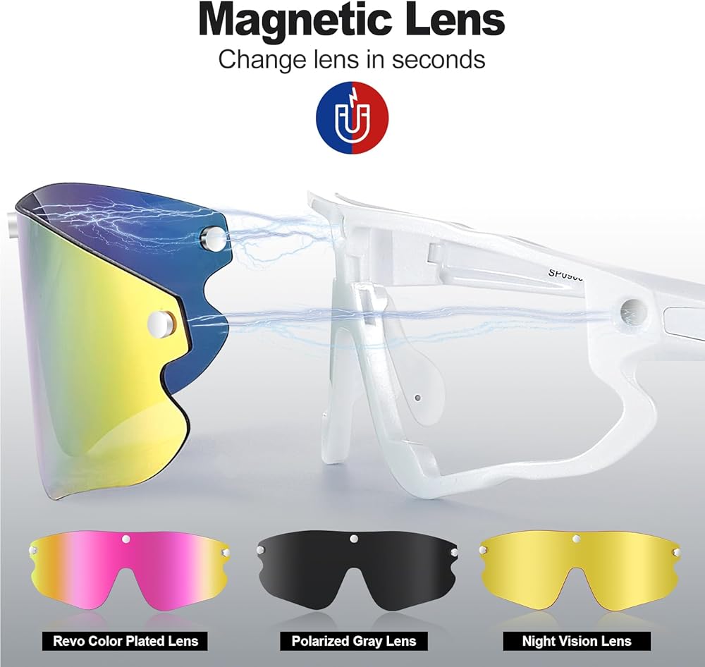 • 🚴【3 عدسات مغناطيسية قابلة للتبديل】نظارات ركوب الدراجات الرياضية هذه هي وظيفة استبدال العدسات المغناطيسية توفر أقوى تأثير امتصاص، واستبدال العدسات الملونة المختلفة بسرعة دون لمس سطح المرآة. انتباه!!! العدسة السوداء فقط هي المستقطبة.
