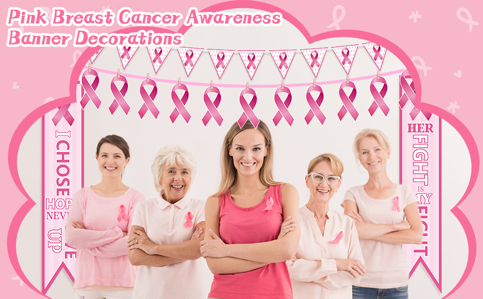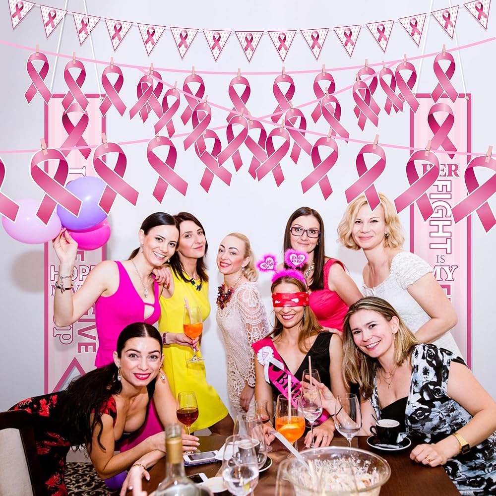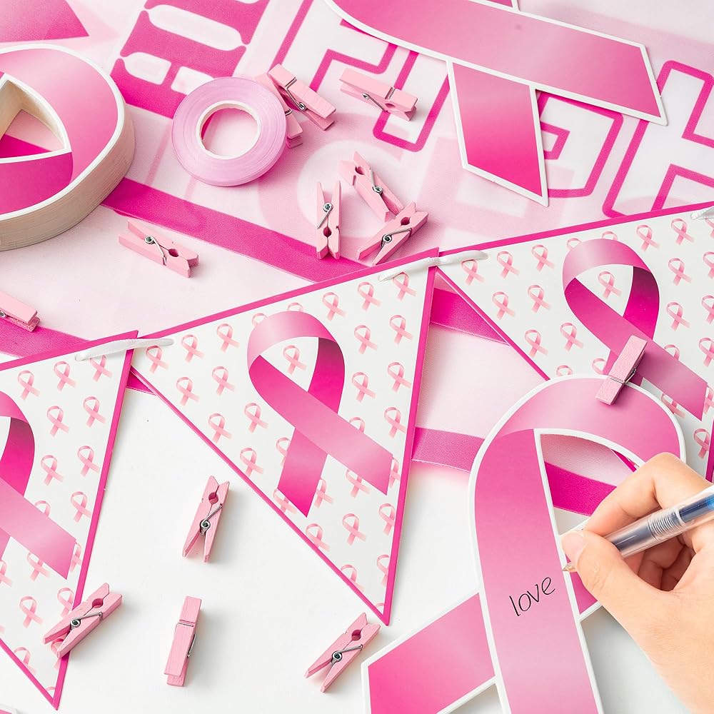 cnhoqc 124pcs الوردي مجموعة الديكور راية التوعية بسرطان الثدي، مجموعة مع راية العلم الشريط الوردي، انقطاع الشريط الوردي، الأزواج، المشابك الوردية مع الشريط لشهر التوعية بسرطان الثدي الطرف العرض