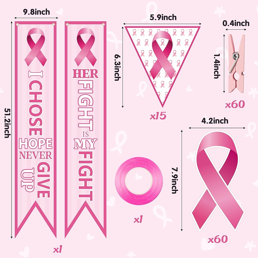 حزمة القيمة: احصل على كل ما تحتاجه في حزمة واحدة! مع لافتة راية بشريط وردي واحد، و60 قطعة من قطع الشريط الوردي، و60 قطعة من المشابك الخشبية الوردية، وشريط وردي واحد، و2 مقطعين، جميعها تتميز بعناصر التوعية بسرطان الثدي، وكمية كافية يمكن أن تلبي احتياجاتك الزخرفية.