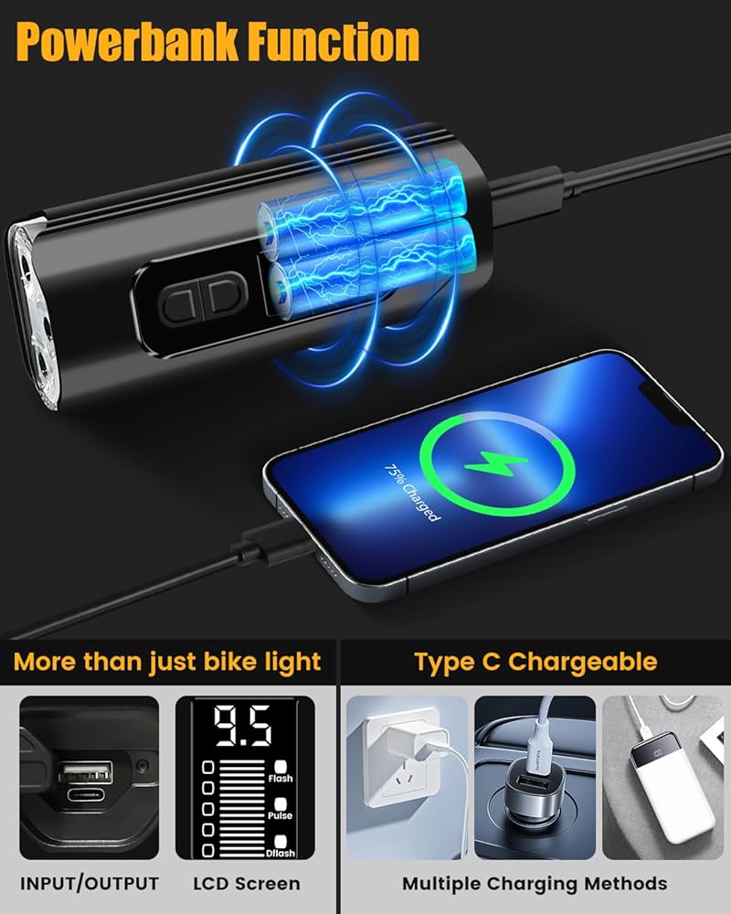البطاريات القابلة لإعادة الشحن: قابلة لإعادة الشحن عبر منفذ USB من النوع C لمزيد من الراحة، وتوفر الشحنة الواحدة أكثر من 40 ساعة من الاستخدام. يمكن أيضًا أن يعمل المصباح الأمامي للدراجة القابل لإعادة الشحن بمثابة بنك طاقة لشحن هاتفك والأجهزة الأخرى