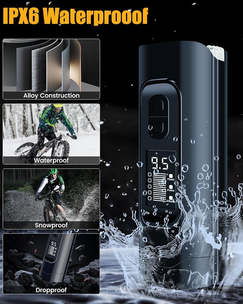 قوي ومتين: صُمم الهيكل المصنوع من سبائك الألومنيوم بدرجة الطيران ليدوم طويلاً، وهو متين ومقاوم للسقوط ومصمم لتبديد الحرارة بسرعة. بفضل تصنيف IPX-6 المقاوم للماء، يعمل المصباح الأمامي للدراجة بشكل موثوق في الطقس القاسي، حتى في الأمطار الغزيرة. الرياح والأمطار لن تقف في طريقك