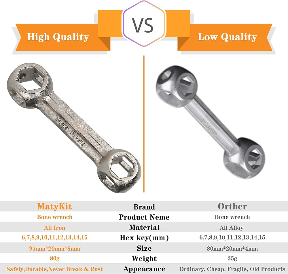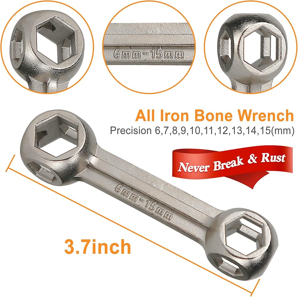 مفتاح ربط عظمة 10 في 1 - يتضمن فتحة سداسية 6، 7، 8، 9، 10، 11، 12، 13، 14، 15 ملم. 3.7 بوصة، قوي جدًا وصغير الحجم، لن ينكسر أبدًا ويحمي يديك. قالب صب متكامل، جميع المكواة.