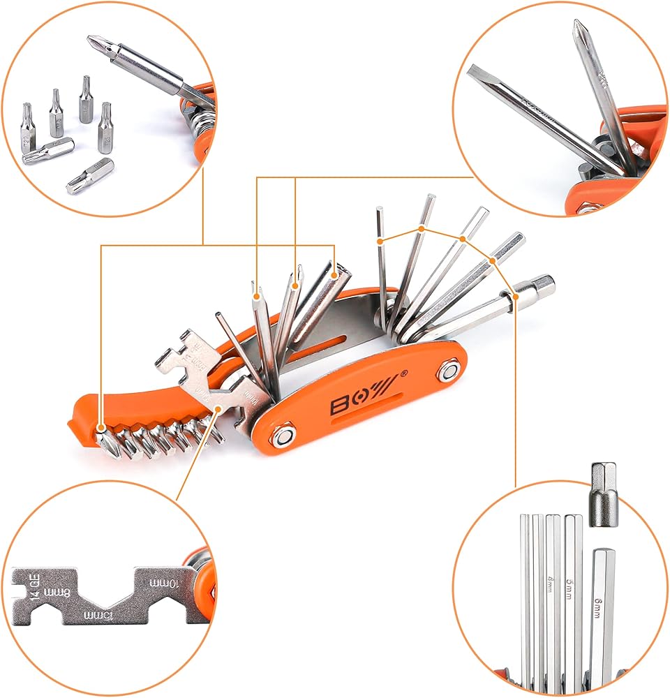 طقم إصلاح الدراجة مع حقيبة أدوات تتضمن مضخة دراجة + أداة متعددة للدراجة + مستخرج كرنك ومفتاح ربط + مفتاح ربط عظمة + رافعة إطار + مجموعة رقع دراجة بدون غراء.