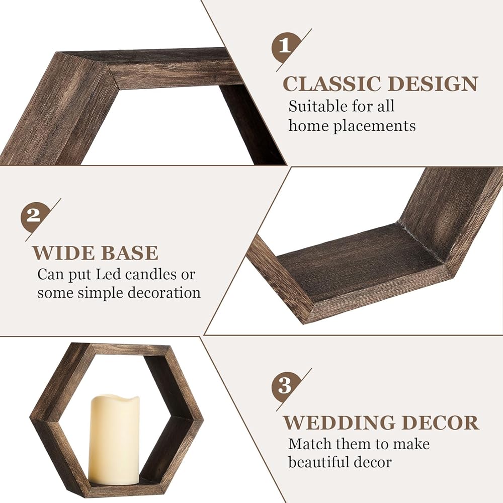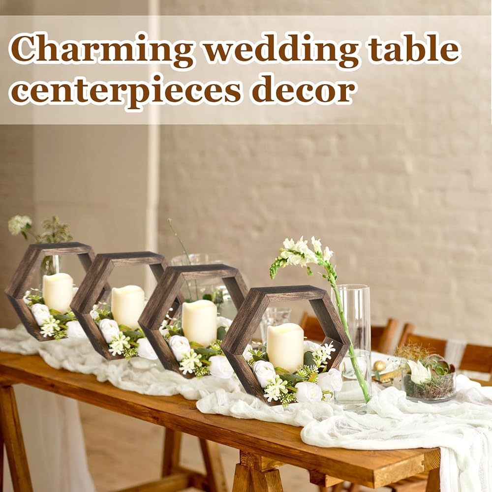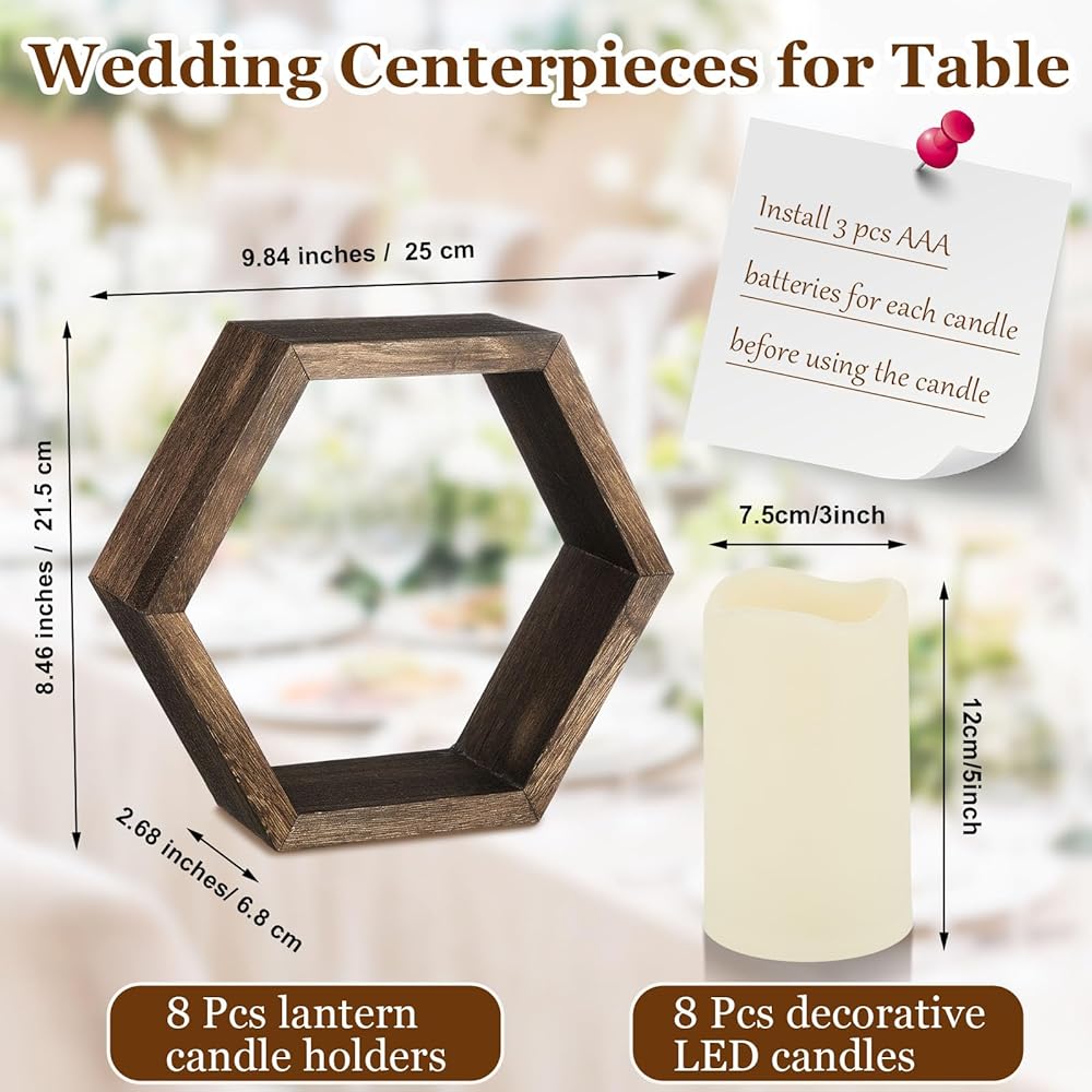 مجموعة فوانيس الشموع الخشبية المكونة من 16 قطعة تتضمن 8 قطع مركزية لحفلات الزفاف الريفية لفوانيس الشموع المزخرفة للطاولة و8 شموع LED مزخرفة عديمة اللهب لحفلات الزفاف، بني داكن، سداسي