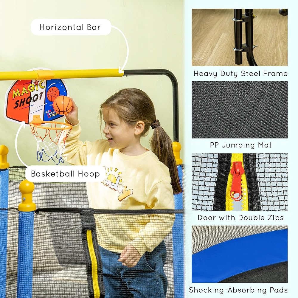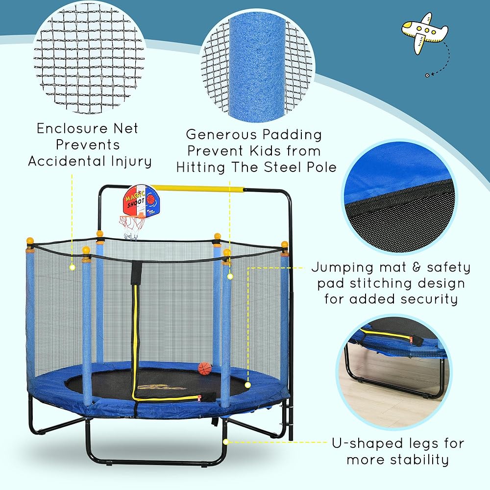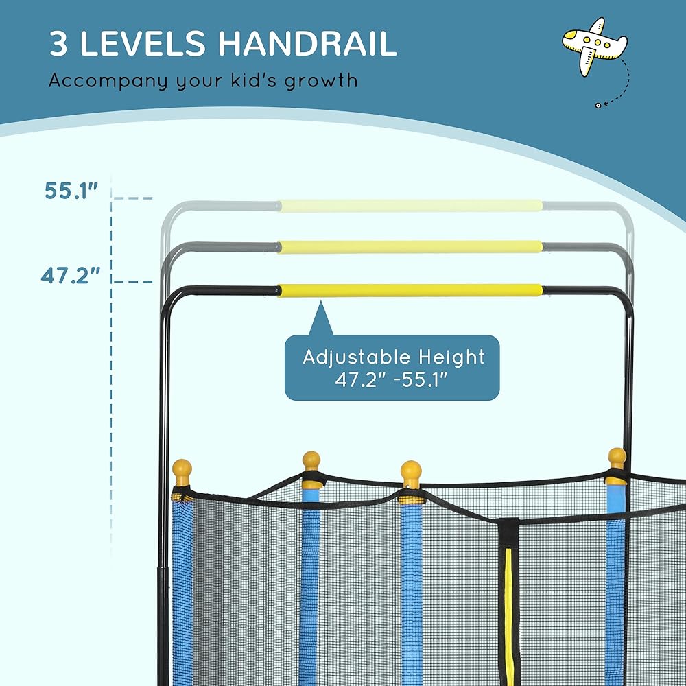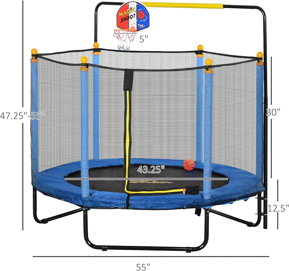 معلومات الترامبولين الداخلي للأطفال: الأبعاد الإجمالية: القطر 55 بوصة × الارتفاع 47.25 بوصة - 55 بوصة. مناسب للأطفال من عمر 3 إلى 10 سنوات. سعة الوزن: 110 رطل. يلزم التجميع.