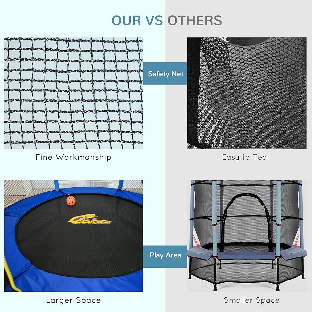السلامة: توفر الحبال المطاطية خيارًا أكثر أمانًا من الزنبركات، مما يقلل من خطر الألم أو الإصابات. أعمدة سميكة مبطنة ومنصات أمان لمنع الحوادث. شبكة تحيط بالترامبولين الترفيهي، حتى لا يسقط الأطفال أثناء القفز.