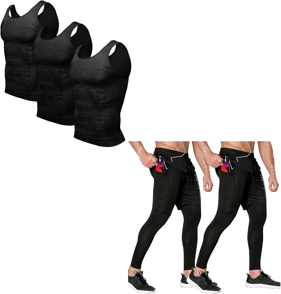 Men's 3 Pack Body Shaper Slimming Shirt Tummy Lose Weight Shirt and 2 Pack Mens Compression Pants Black, L