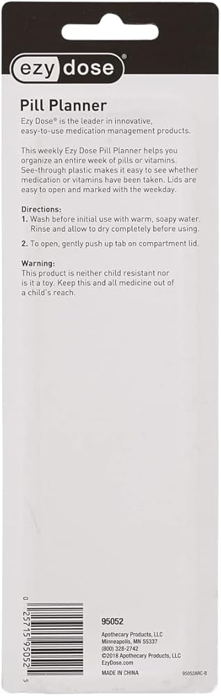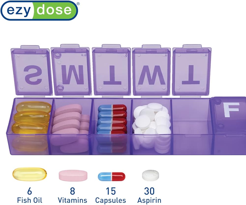Great for over-sized pills or multiple pills per day a week. Snap lids have large letters to mark the days of the week. Each compartment holds 30 aspirin tablets. Ezy Dose is the leader in easy-to-use medication management products. Ezy Dose products make living healthier simply easier with products like pill cutters, pill crushers and a full line of easy-fill planners.
