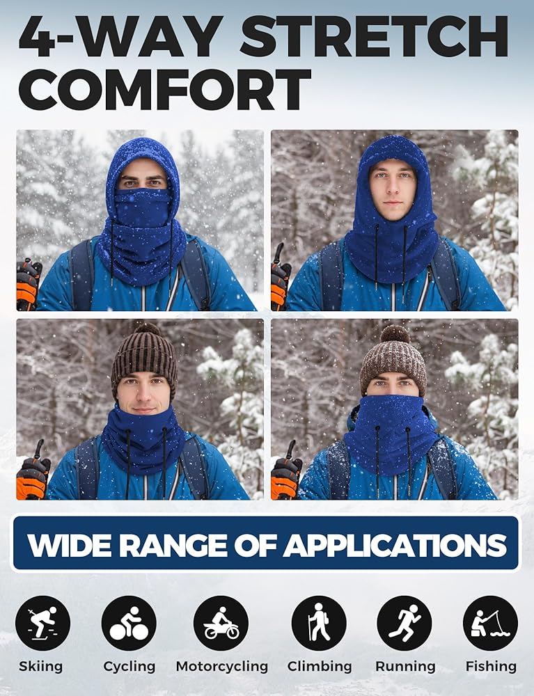 • Warm and breathable for men: Our thermal balaclava fleece hood mask is soft comfortable material provide wind and cold protection, warm and breathable enough to protect your face, neck, ears and nose from cold, wind, dust and snow. This balaclava ski mask is great for outdoor work, sports and activities, such as skiing, cycling, motorcycling, hiking, running, fishing, etc. The slightly elastic design allows you to adjust the coverage, which can better prevent cold and wind, and provide warmth