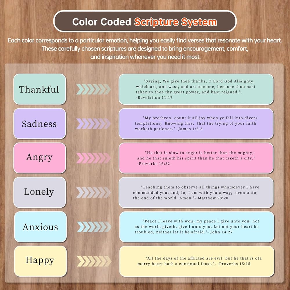 التوجيه الروحي: يحتوي وعاء الآية الكتابية الخاص بنا على 90 آية مختارة مشفرة في 6 ألوان، تغطي مجموعة واسعة من المشاعر والمشاعر. مع كل بطاقة يتم سحبها بسهولة دون الحاجة إلى فتحها، يمكنك الانغماس في حكمة الله ويسوع. هذه الآيات سوف تملأ قلبك، وترشدك خلال ضباب الروح. توفر قراءة آيات الكتاب المقدس هذه التشجيع والدعم في مواجهة تحديات الحياة مع تقوية إيمانك الداخلي ومرونتك