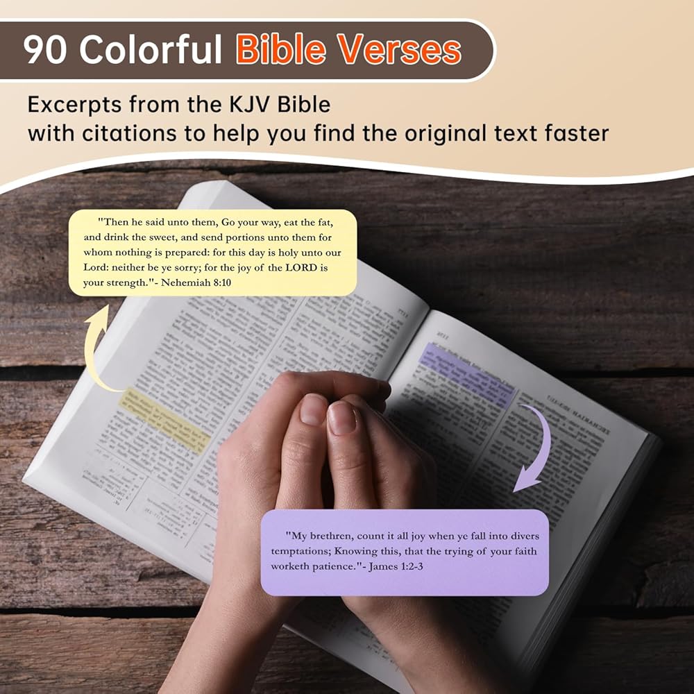 لوازم دراسة الكتاب المقدس: الآيات الموجودة في صندوق الصلاة كلها من نسخة الملك جيمس (KJV) وتأتي مع اقتباسات، تشير بوضوح إلى الفصل والآية لتسهيل الرجوع إليها. يساعدك هذا في العثور على سياق كلمة الله ومواصلة دراسته. الطباعة الواضحة والدقيقة تجعل القراءة والحفظ أسهل، مما يجعلها أداة مثالية لدراسة الكتاب المقدس