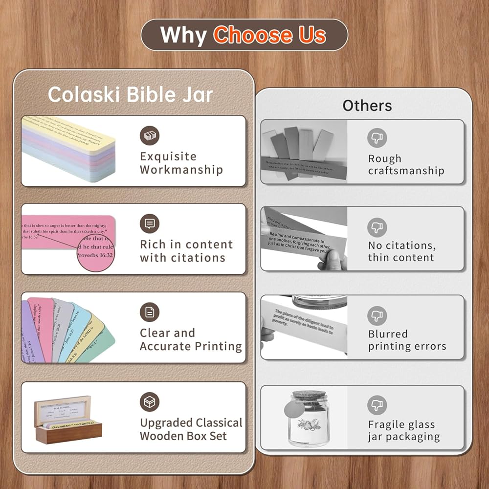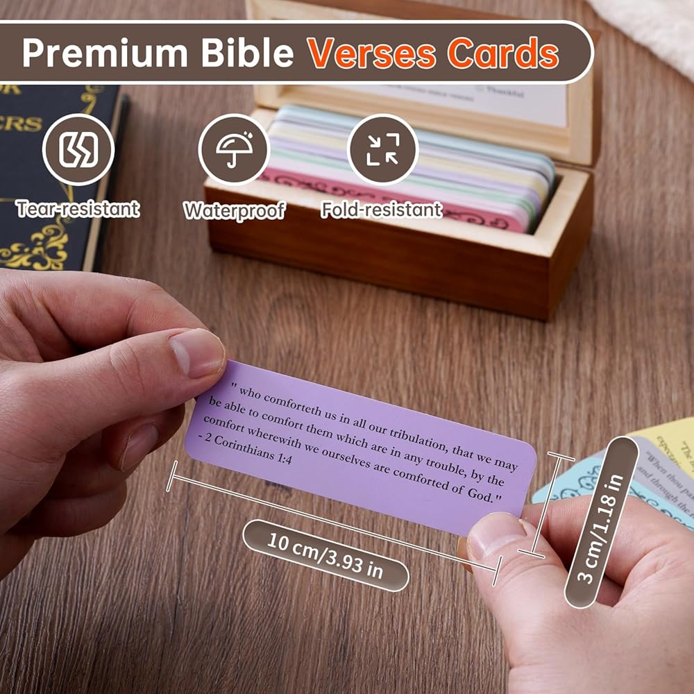 الحكمة الدائمة من الكتاب المقدس: توجد بطاقات الصلاة من الكتاب المقدس في صندوق خشبي بتصميم كلاسيكي ريفي، مما يخلق جوًا فريدًا من الإيمان. تتم طباعة الكتاب المقدس على ورق مطلي فاخر، مع تصفيح على الوجهين مما يضمن أنها مقاومة للماء ومقاومة للتمزق وتدوم طويلاً. سواء تم استخدامه للصلاة اليومية، أو دراسة الكتاب المقدس، أو كهدية إيمانية، فإن وعاء الآية هذا سوف يرافقك في تجربة حكمة الله وحبه.