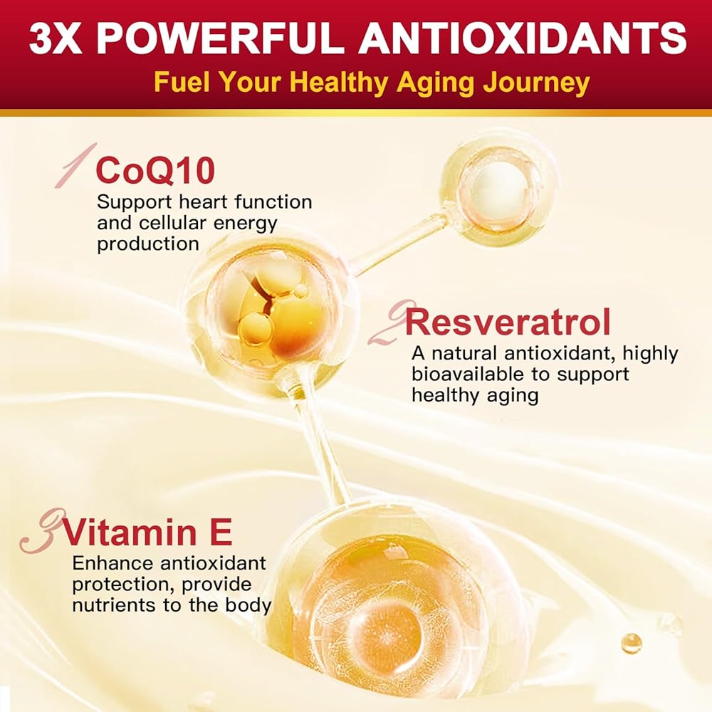 قوة ثلاثية مضادة للأكسدة: كبسولات CoQ10 300 ملغ معززة بالريسفيراترول وفيتامين E، مما يوفر دعمًا ثلاثيًا مضادًا للأكسدة. يحارب هذا المزيج القوي الجذور الحرة، ويدعم نمو الخلايا، ويعزز صحة القلب، ويساعد في الشيخوخة الصحية.