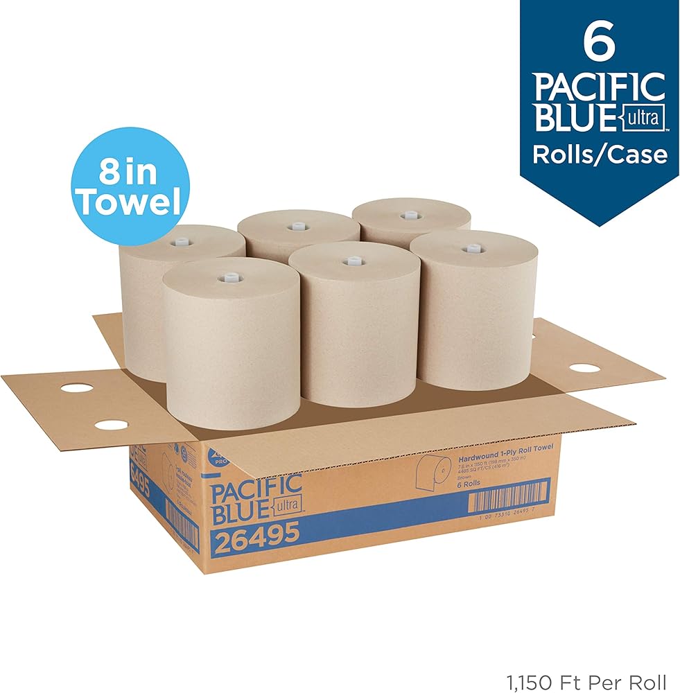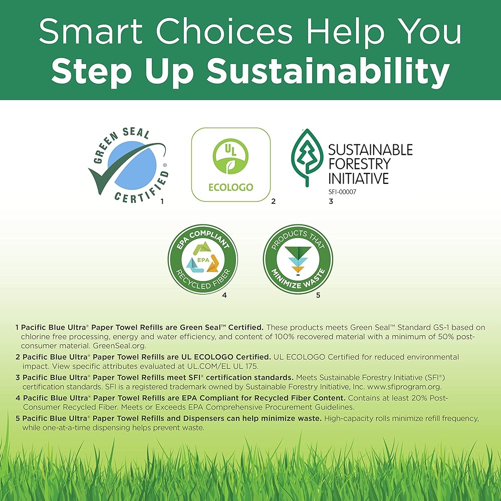 Pacific Blue Ultra 8" High-Capacity Recycled Paper Towel Rolls deliver 1,150 feet per roll and the flexibility to fit both automated (59590) and mechanical (59589, 59594) Pacific Blue Ultra towel dispensers. Our towels are designed for lower maintenance, higher efficiency and improved customer satisfaction. Pacific Blue Ultra 8" High-Capacity Recycled Paper Towel Rolls can help earn LEED credits. They contain at least 40% post-consumer recycled fiber to meet or exceed EPA Comprehensive Procurement Guidelines. These white paper towels are also available in a 3-roll case (26491) if storage space is at a premium. Also available in brown in 3-roll (26496) and 6-roll (26495) cases. The LEED Certification mark is a registered trademark owned by the U.S. Green Building Council and is used by permission.