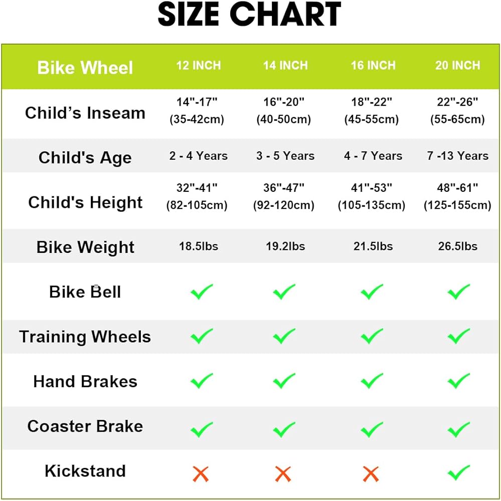 نطاق التركيب: 12 بوصة لأكثر من عامين، الارتفاع 32 بوصة - 41 بوصة؛ 14 بوصة لعمر 3-5 سنوات، الارتفاع حوالي 36 بوصة - 47 بوصة؛ 16 بوصة لعمر 4-7 سنوات، الارتفاع حوالي 41 بوصة -53 بوصة