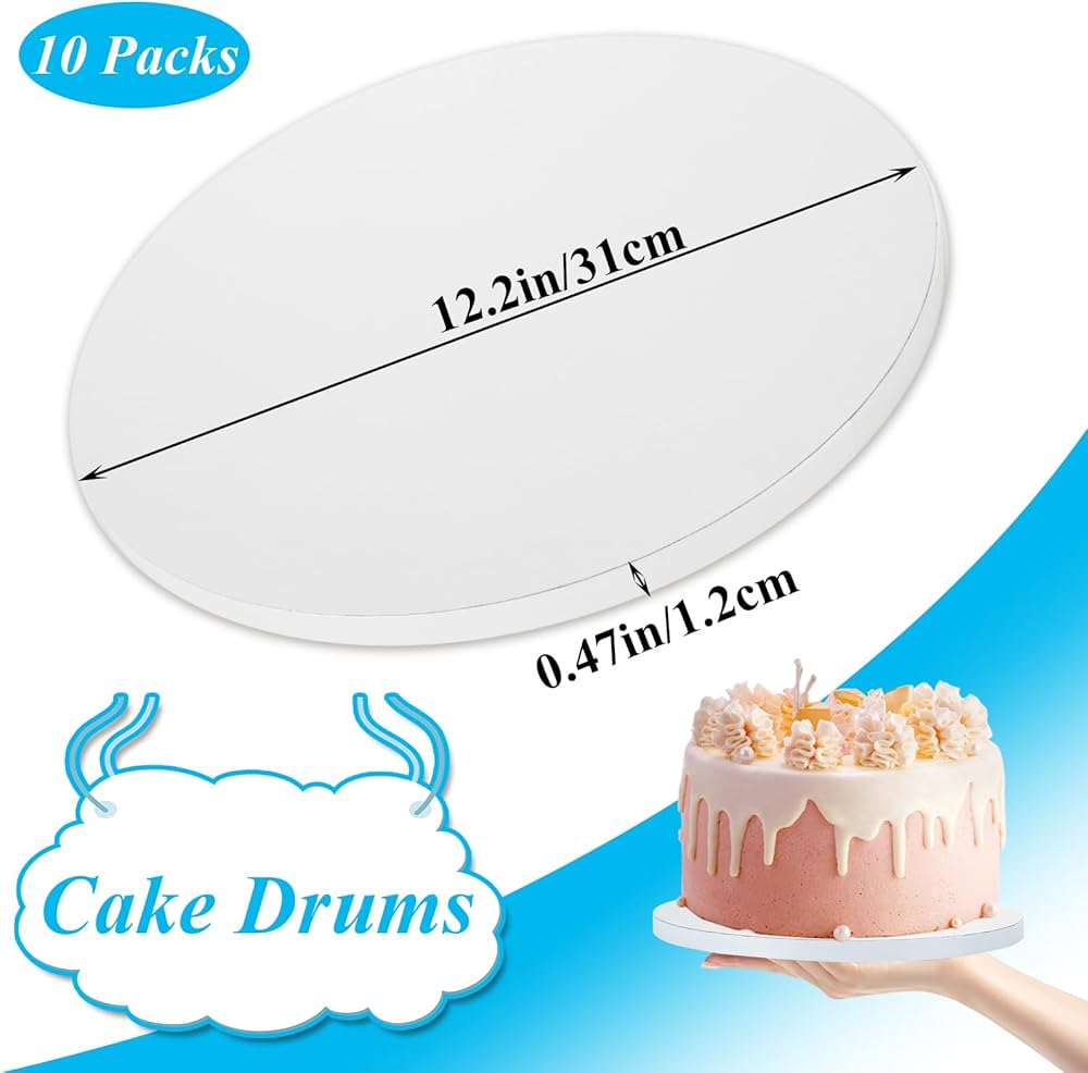 طبول الكيك البيضاء: سوف تحصل على 10 عبوات من طبول الكيك البيضاء بقطر 12 بوصة وسمك 1/2 بوصة. إنه حجم مثالي لحمل كعكة عيد الميلاد أو الذكرى السنوية في غضون 10 بوصة