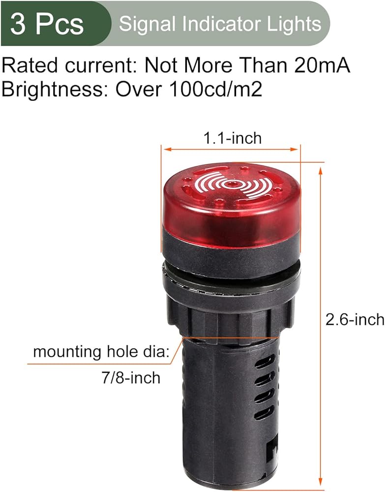 WHAT YOU GET - The package comes with 3pcs LED Indicator Lights that measure rated voltage: AC/DC 12V; lens' color: Red; model: AD16-22SM; mounting hole size: 22mm (7/8 Inch); light type: Flashing LED; type: Intermittent; rated current: Not More Than 20mA; brightness: Over 100cd/m2; continuous working life: Over 30000h; withstand voltage: 2.5KV for 1 Minute; insulation resistance: Over 2 Milliohm; protective degree of the shell: IP40; overall size: 66 x 28mm / 2.6 Inch x 1.1 Inch (L*Head D).