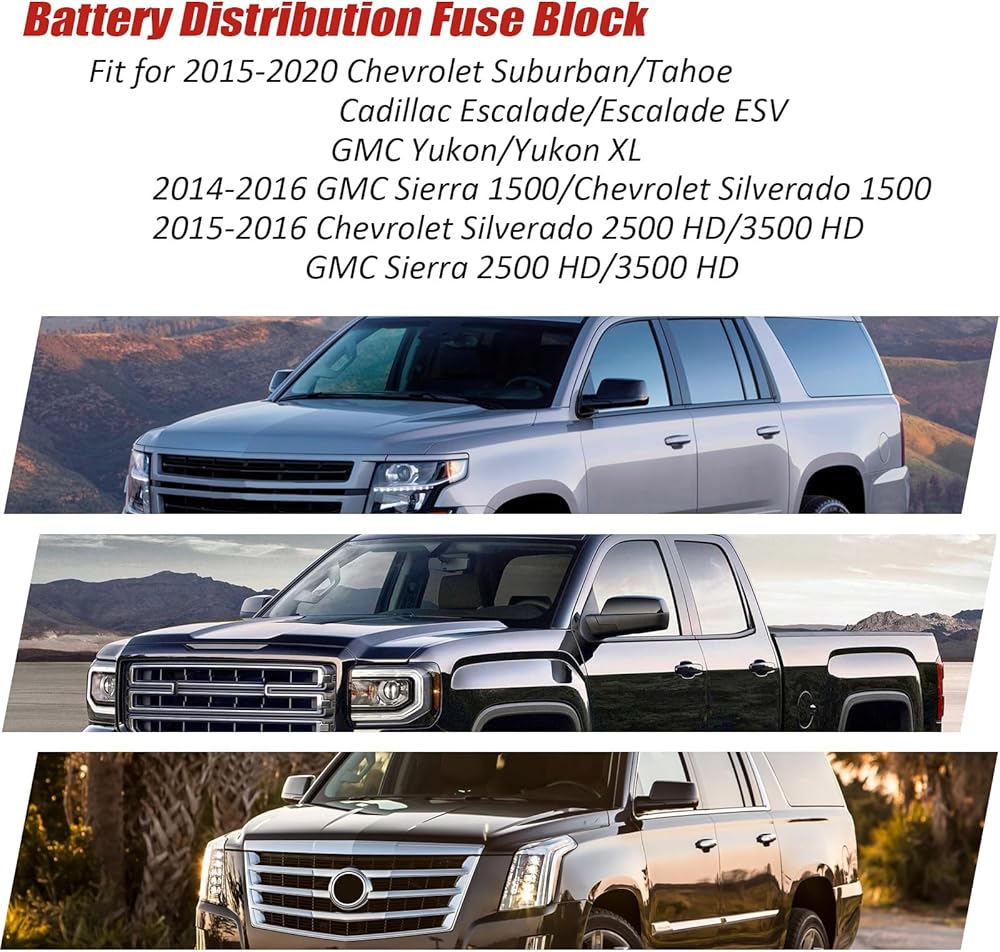 الملاءمة: كتلة مصهر توزيع البطارية Tesmirror مناسبة مع 2015-2020 شيفروليه سوبربان/تاهو/كاديلاك إسكاليد/إسكاليد ESV/جي إم سي يوكون/يوكون XL؛ 2014-2016 جي إم سي سييرا 1500/شيفروليه سيلفرادو 1500; 2015-2016 شيفروليه سيلفرادو 2500 HD/3500 HD/جي إم سي سييرا 2500 HD/3500 HD.