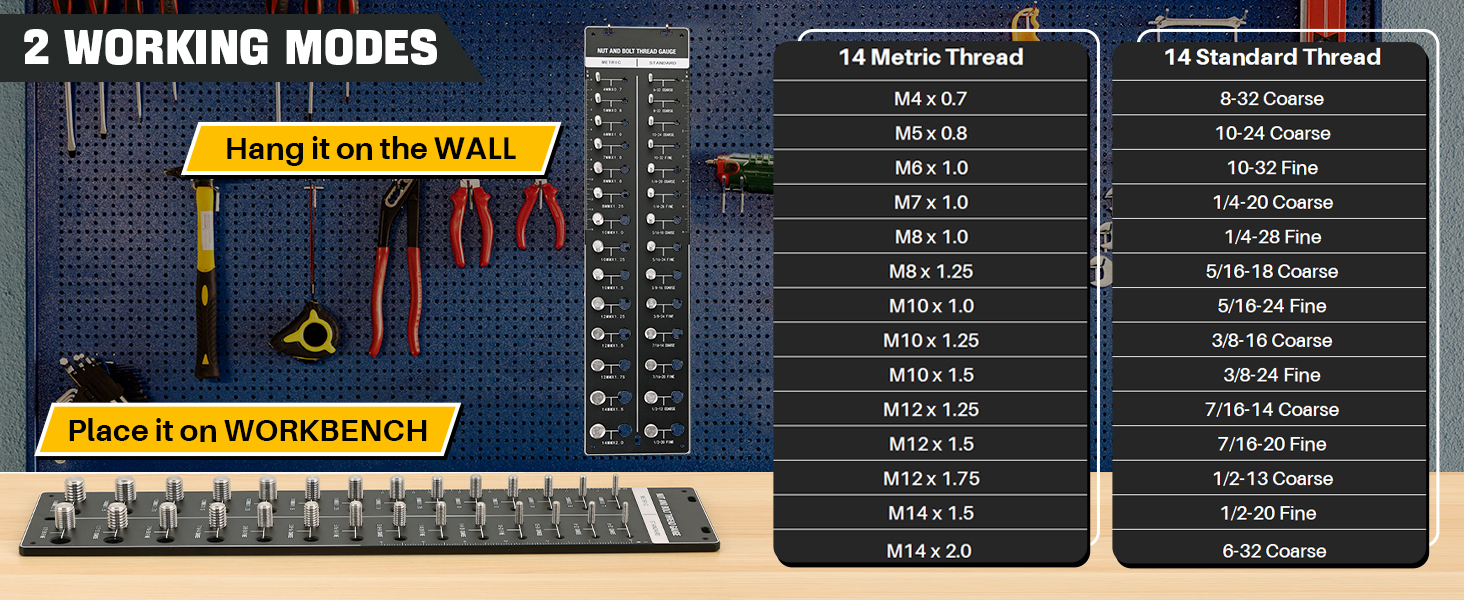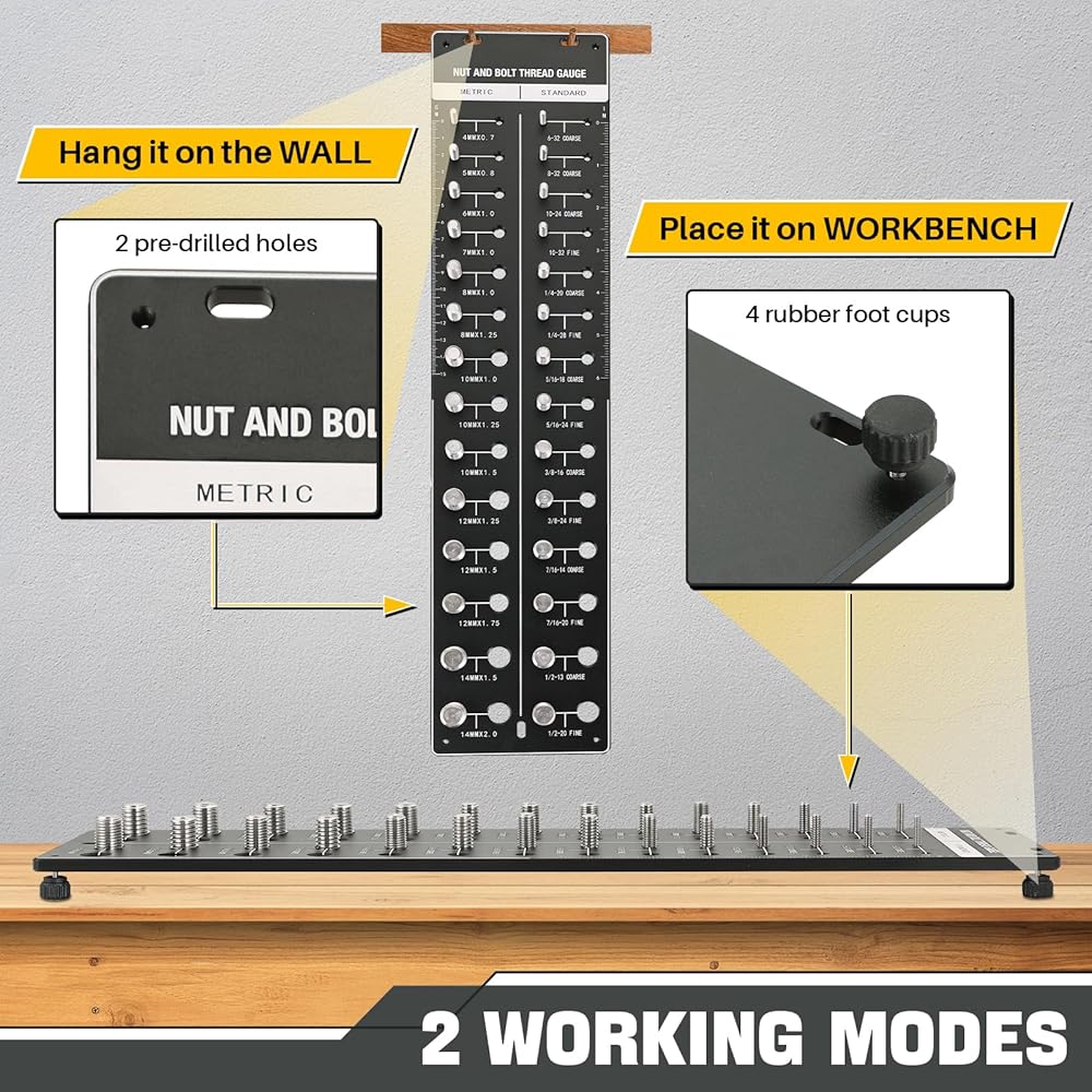• فاحص الخيط الأساسي: يعد فاحص حجم الخيط أداة أساسية للمحترفين وعشاق الأعمال اليدوية على حد سواء، ويساعد على تنظيم البراغي والصواميل الفوضوية. بفضل التصميم المتكامل وفتحات التثبيت المعدة، فإنه يضمن الراحة وسهولة الاستخدام، سواء تم تركيبه على الحائط أو على صندوق الأدوات. تقدم كلاً من معايير SAE ومقاييس الخيوط المترية، وتصبح رفيقًا لا غنى عنه لمختلف المهنيين بما في ذلك ميكانيكا السيارات والنجارين واللحام والسباكين والمهندسين الميكانيكيين وعشاق إصلاح السيارات وفنيي الورش.