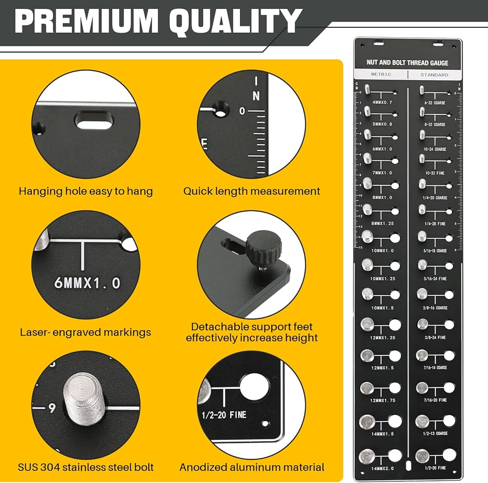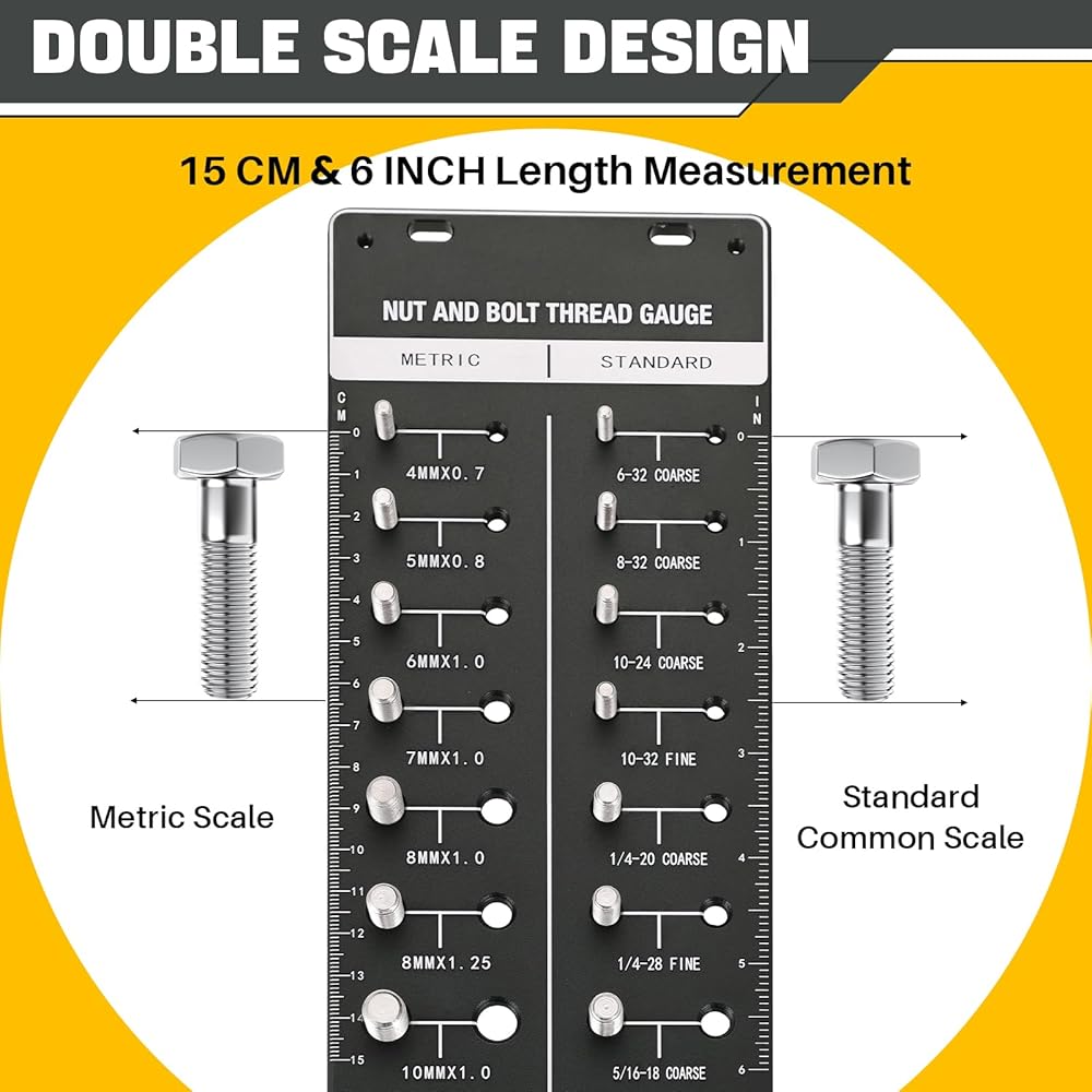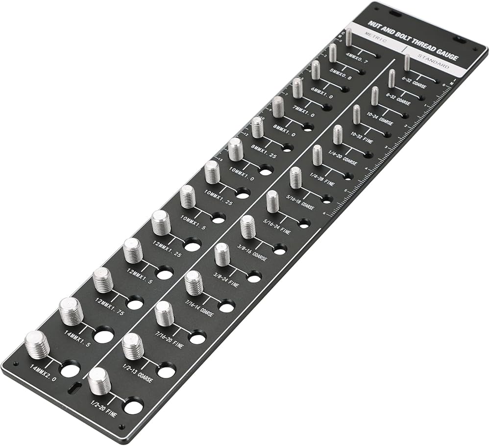 • فحص الأبعاد الشامل: يحتوي حجم الترباس ومقياس الخيط على 14 مقاسًا متريًا و14 مقاسًا قياسيًا مع مسطرة بالبوصة والسنتيمتر. يمكنه التعرف على ما يصل إلى 28 حجمًا مختلفًا من البراغي والصواميل، بما في ذلك أحجام الخيوط المترية من M4 x 0.7 إلى M14 x 2.0، والخيوط القياسية من #6 - 32 FINE إلى 1/2 - 20 FINE. لا يستغرق الأمر سوى بضع ثوانٍ للتمييز بسرعة ودقة بين البراغي والمسامير والصواميل ذات الأحجام المختلفة. لا غنى عنه مطلقًا إذا كنت تعمل باستخدام مثبتات مختلفة بشكل منتظم.