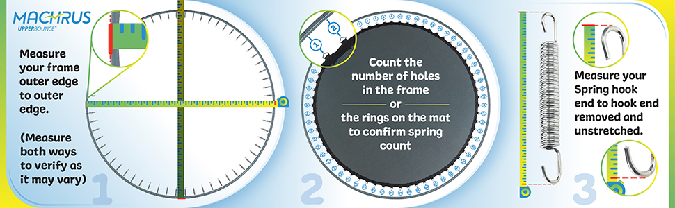 Mat's Compatibility: Please carefully measure the frame size (edge to edge), count the number of springs or v-rings, and measure the size of the unstretched spring (hook to hook) to select the right trampoline mat. This replacement jumping mat comes with 84 v-rings and matches the 13x13ft square frame and 7.5” spring in length