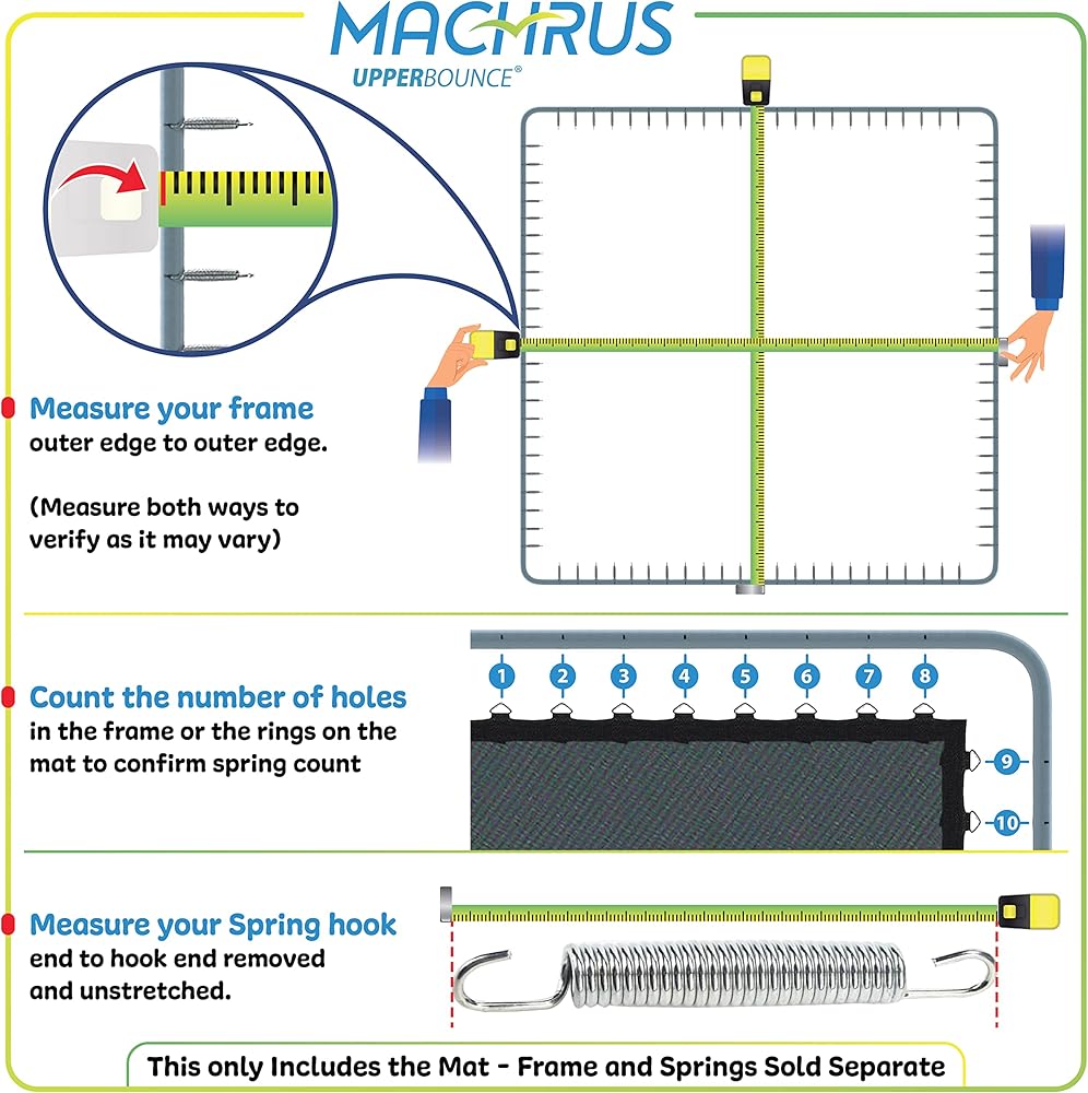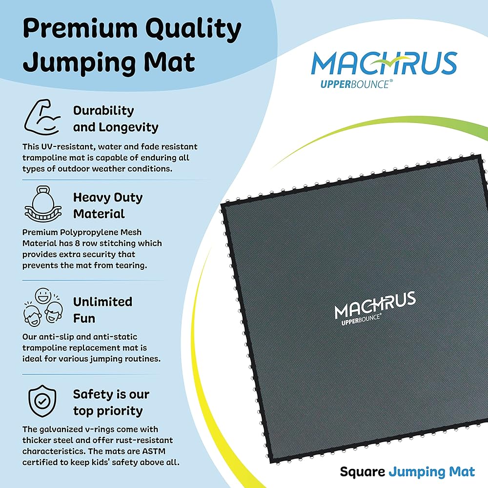 Bring back your trampoline bounce with this new & strong "Upper Bounce" Trampoline jumping mat! "Upper Bounce" Square jumping mat is especially designed to fit 13' X 13' Square trampoline frames of all brands and models, with 84 V-Rings using 7. 5" Springs. Upper Bounce trampoline jumping mat features ultra-durability through its premium PP mesh material. Furthermore, our jumping mat also provides extra security with its 8 row stitching thus ing the mat from tearing. Upper Bounce high quality jumping mat is to be UV & water resistant, offering you a safer long-lasting fun investment!