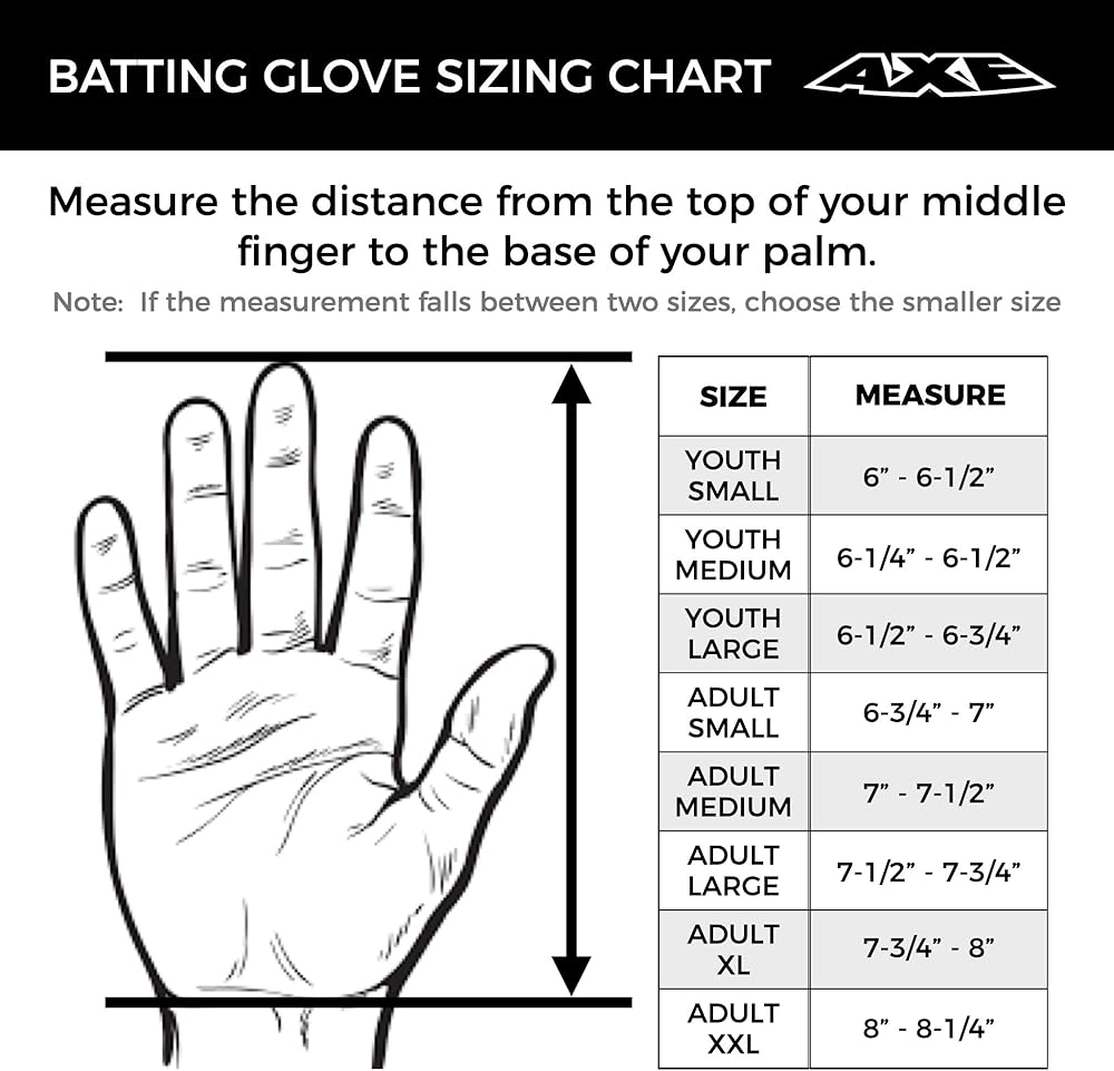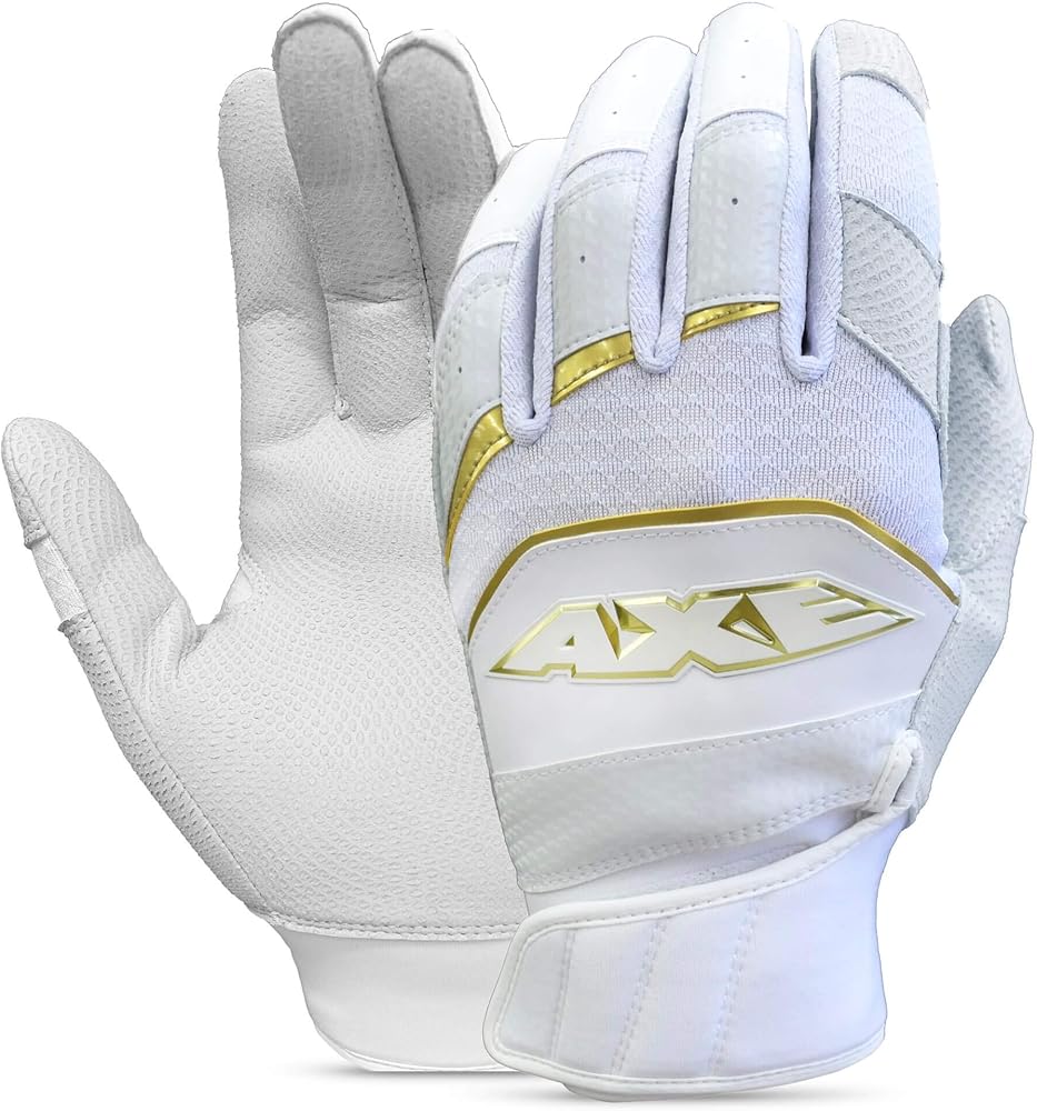 The Axe Pro-Fit batting gloves provide superior feel and durabililty with a digitally embossed 1-piece premium cabretta leather palm and a 4-way stretch knit comforting the back of the hand for flex and comfort. Special leather inserts on the index finger and thumb reinfore high-wear zones. A neoprene reverse-flap cuff provides ultimate fit and mobility. Available in youth and adult sizes.