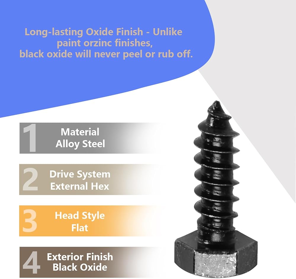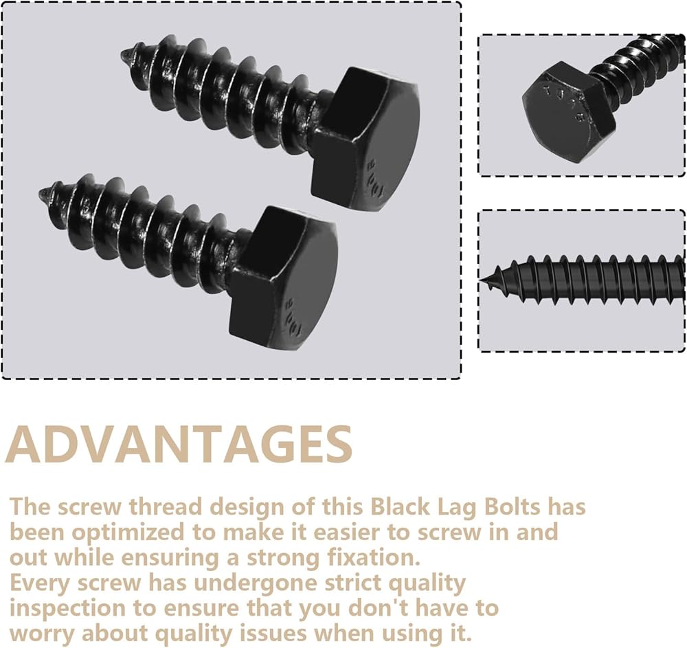 PREMIUM STEEL: These stainless steel black lag screws are coated with black oxide coating for anti-corrosion and rust resistance, providing strength and good corrosion resistance, so you can use them both indoors and outdoors in wet environments.
