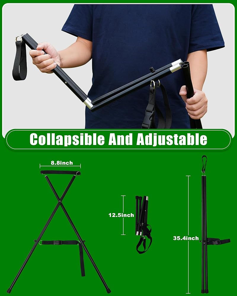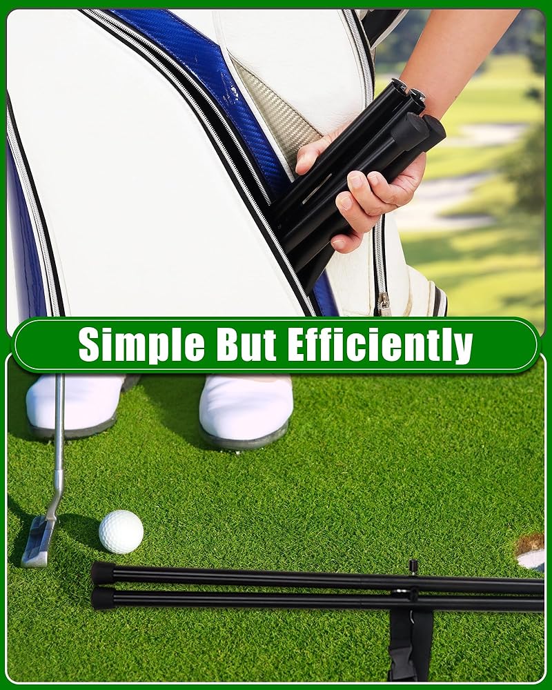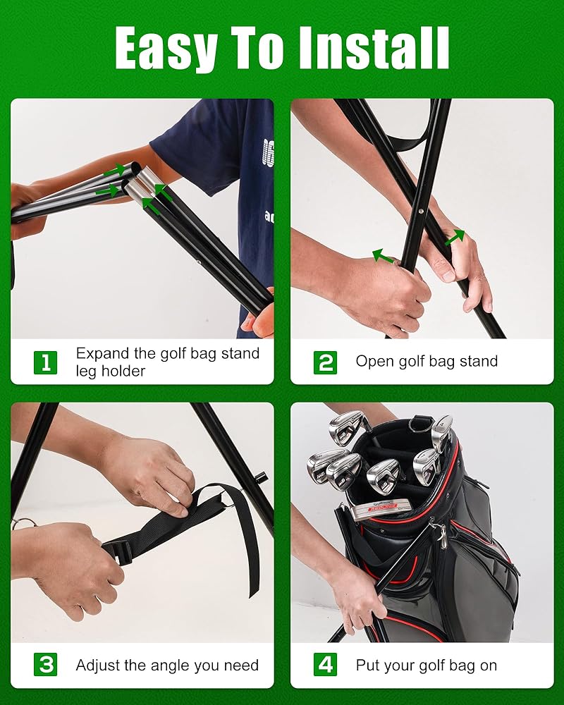 • سهل الإعداد. يأتي حامل حقيبة الجولف القابل للربط الخاص بنا مزودًا بحبل وعصي فولاذية مضادة للانزلاق وعصي مثبتة معًا مثل أوتاد الخيمة ذات الجزء الداخلي المرن الذي يجمعها معًا. يستغرق الأمر بضع ثوانٍ فقط لتجميعها معًا. خفيفة الوزن وقوية بشكل مناسب. إنه قابل للتعديل باستخدام الإبزيم، يمكنك تغيير الزاوية التي تحتاجها لإضافة الثبات إلى حقيبة عربة الجولف الخاصة بك
