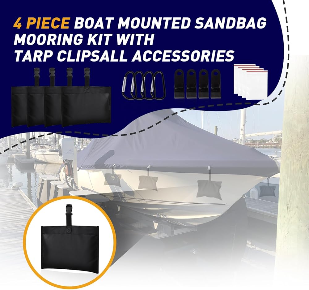 مجموعة كاملة مع ملحقات مشبك القنب: بالإضافة إلى أكياس الرمل، تأتي هذه المجموعة مع ملحقات مشبك القنب الأساسية للحصول على حل إرساء آمن وموثوق لغطاء القارب الخاص بك.