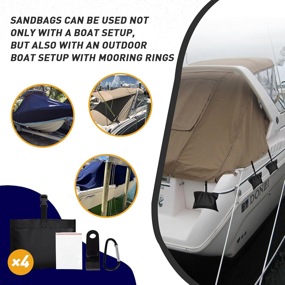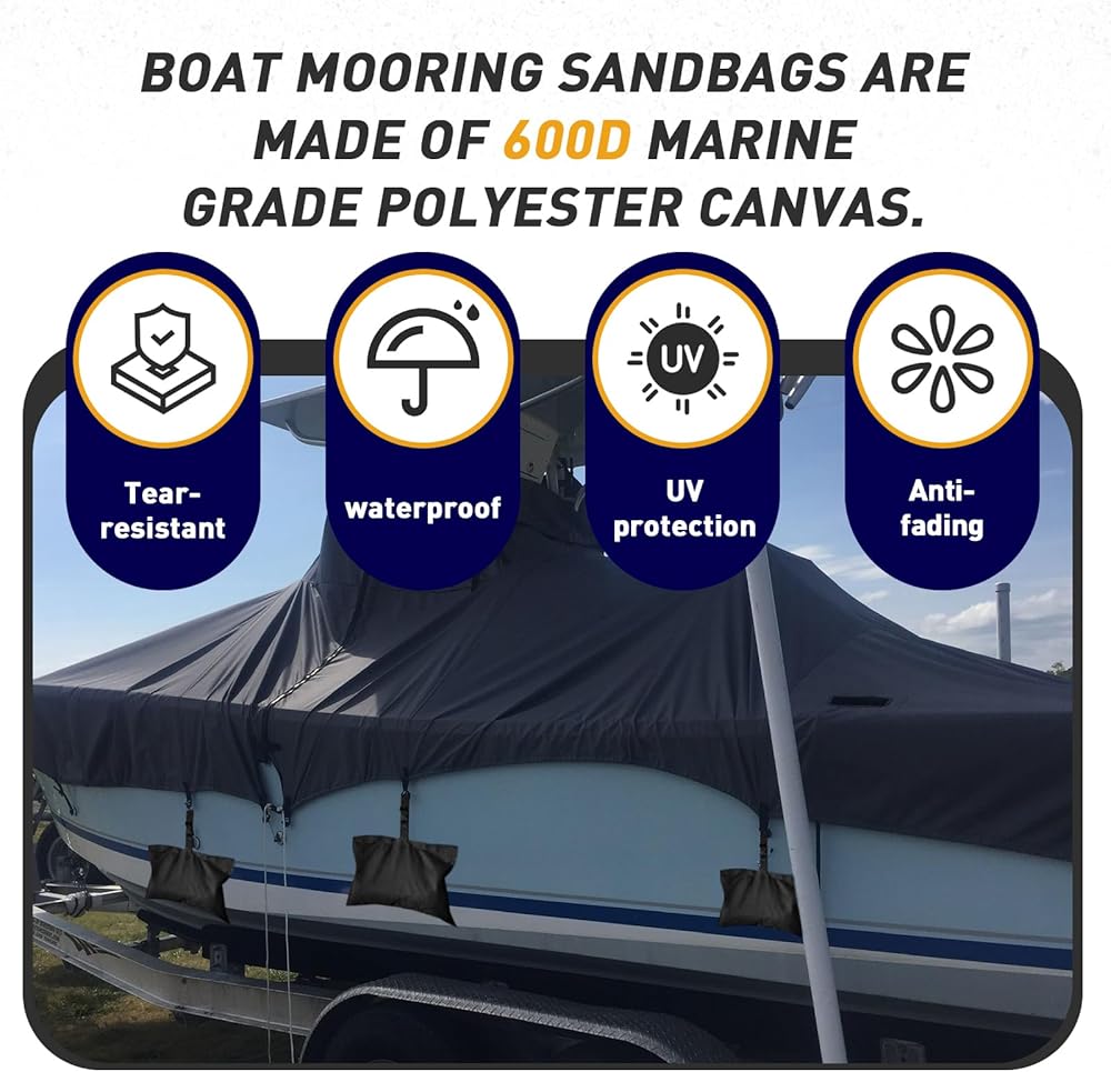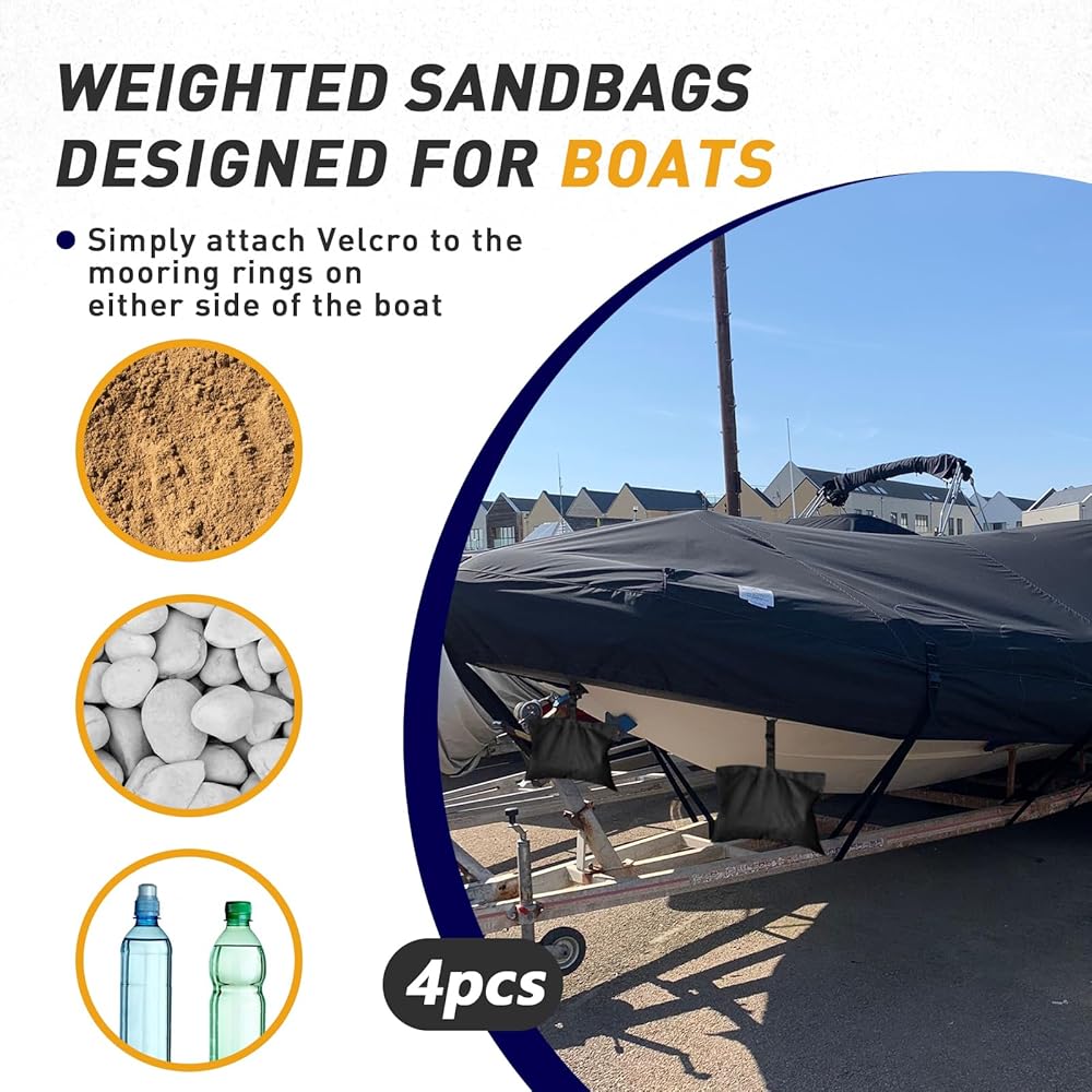 طقم رباط حقيبة الرمل المتين بغطاء قارب: تحتوي هذه المجموعة الكاملة على 4 أكياس رمل مصنوعة من قماش البوليستر البحري القوي 600D لمزيد من الثبات والوزن لغطاء القارب الخاص بك.