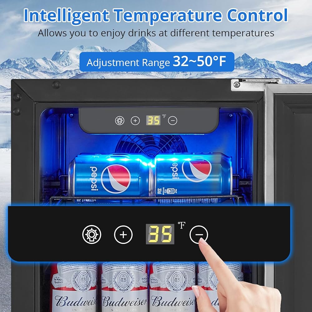 【Single Zone/One-Touch Control】With an LED control display, adjusting the temperature between 32-50°F for your drinks is effortless. The versatile design allows for built-in or freestanding installation, requiring minimal space making it suitable for various settings.