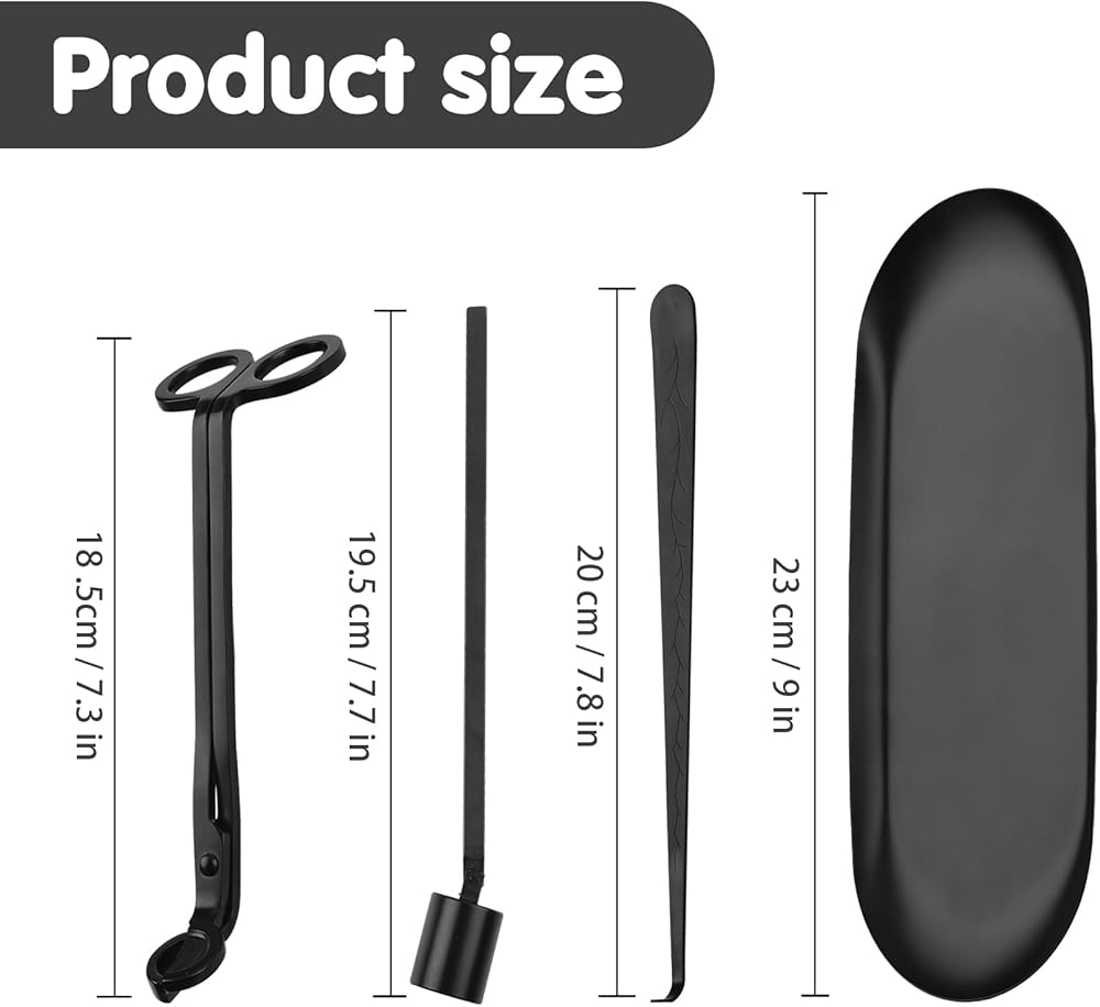 【Good Quality】The 4-in-1 candle accessory set with tray is made of high quality stainless steel for long life and durability. Candle wick trimmer - 18.5cm/7.3inch, Candle wick dipper - 20cm/7.9inch, Candle wick snuffer - 19.5cm/7.7inch, Storage tray plate - 23cm/9inch.