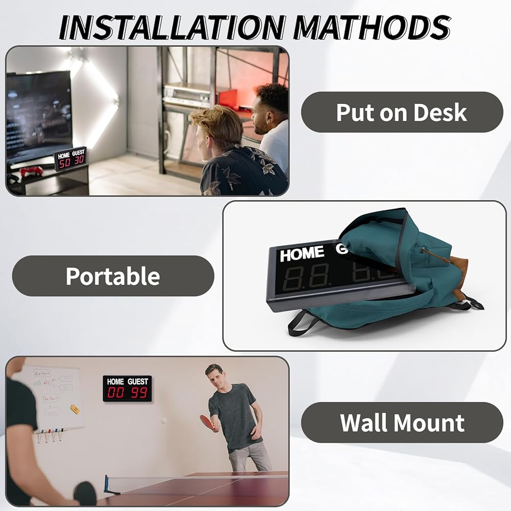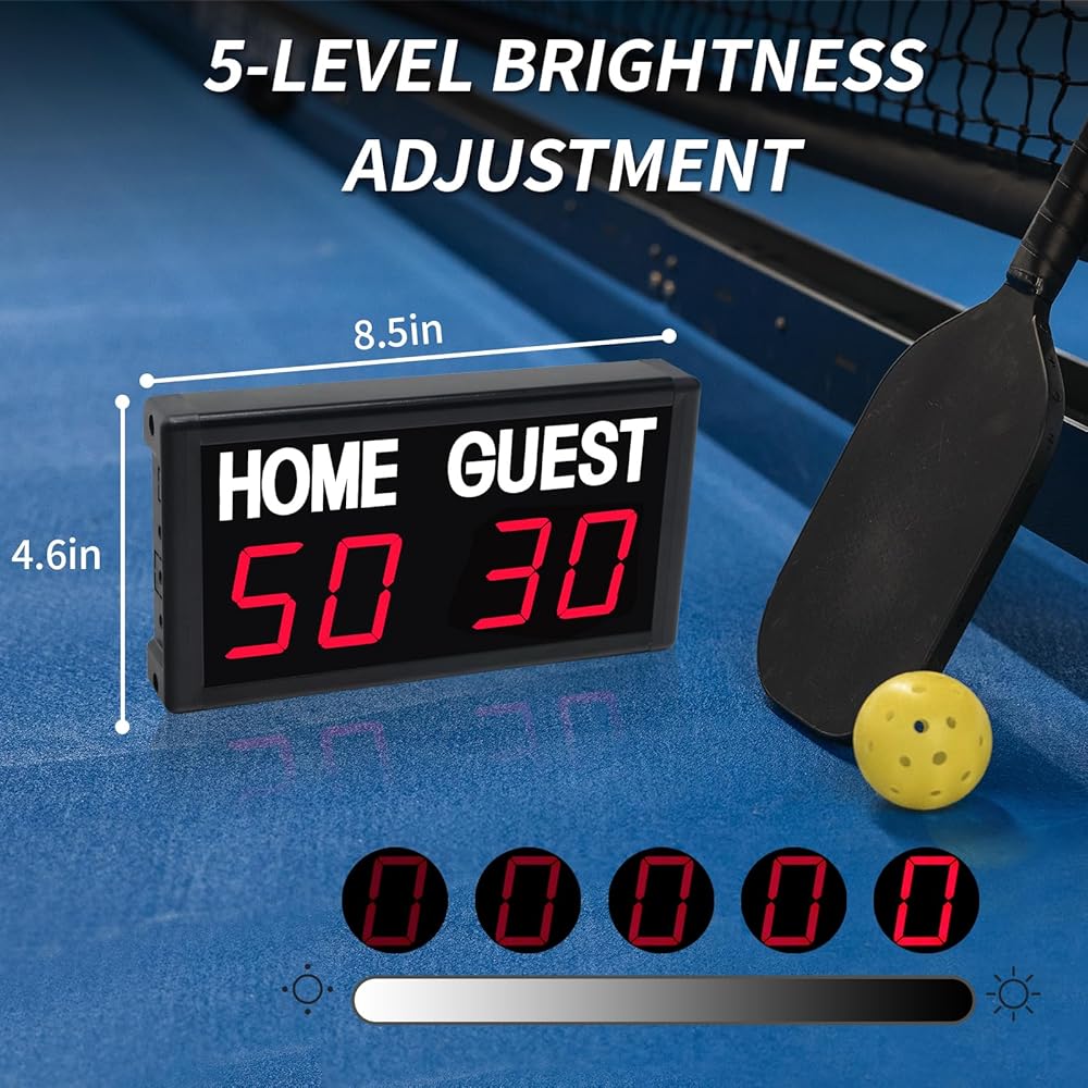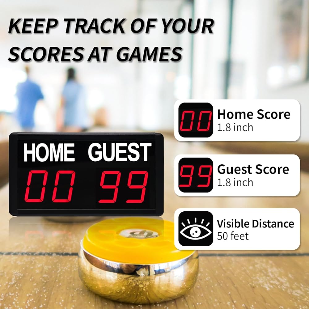 لوحة النتائج الرقمية LED: لوحة النتائج هي 8.5x4.6x1.4 بوصة. مع 1.8 بوصة LED يمكنك رؤيتها بوضوح من مسافة 59 قدمًا. درجات المنزل/الضيف من 1-99 باللون الأحمر/الأخضر. بها 5 مستويات لتعديل السطوع.