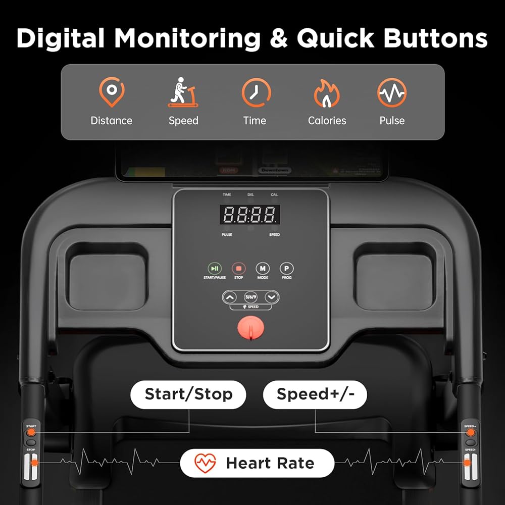 شاشة LED مريحة وجهاز تحكم عن بعد: يمكنك بسهولة تتبع السرعة والمسافة والوقت والسعرات الحرارية المحروقة في الوقت الفعلي من خلال شاشة LED المدمجة لدينا. جهاز التحكم عن بعد المتضمن يجعل ضبط السرعة وإيقاف الآلة أمرًا سهلاً