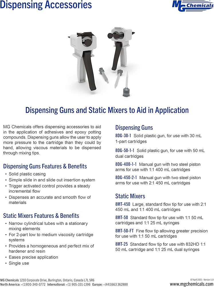 The 8DG-450-2-1 is a manual dispensing gun made of a solid plastic casing and steel piston arms, for use with 2: 1 dual cartridge systems. It features an easy slide in / slide out cartridge insertion system that facilitates cartridge installation in seconds. The trigger activated control provides a steady incremental flow of hardener and resin through an optional static mixer that can be attached to head of the cartridge. Simply pull the trigger and obtain the perfect mix ratio of material needed to complete your task. For use with: 832C-450ML - Translucent Epoxy