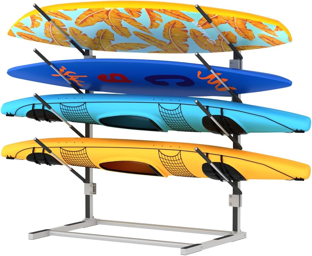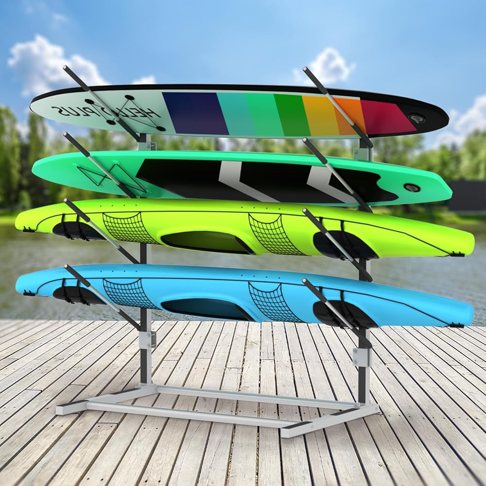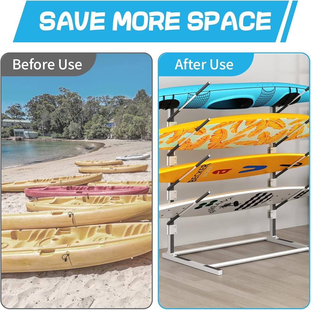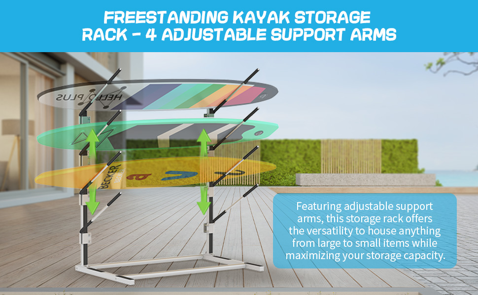 4 أذرع دعم قابلة للتعديل: يوفر رف التخزين القائم بذاته مساحة كبيرة لتخزين معدات الرياضات المائية الخاصة بك. يمكنك تخصيص المسافة لاستيعاب الألواح ذات الأحجام والأشكال المختلفة. قم بتنظيم ما يصل إلى 3-4 قوارب الكاياك وألواح التجديف وألواح ركوب الأمواج والزوارق
