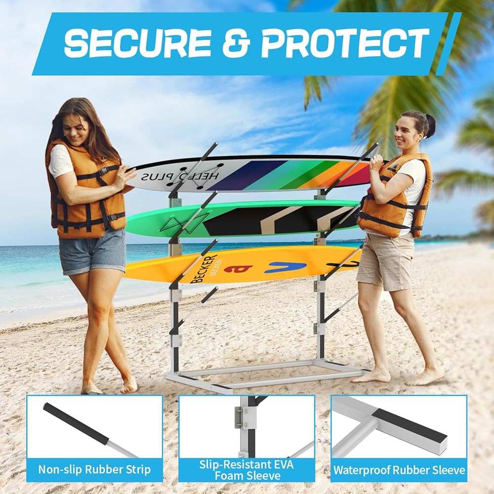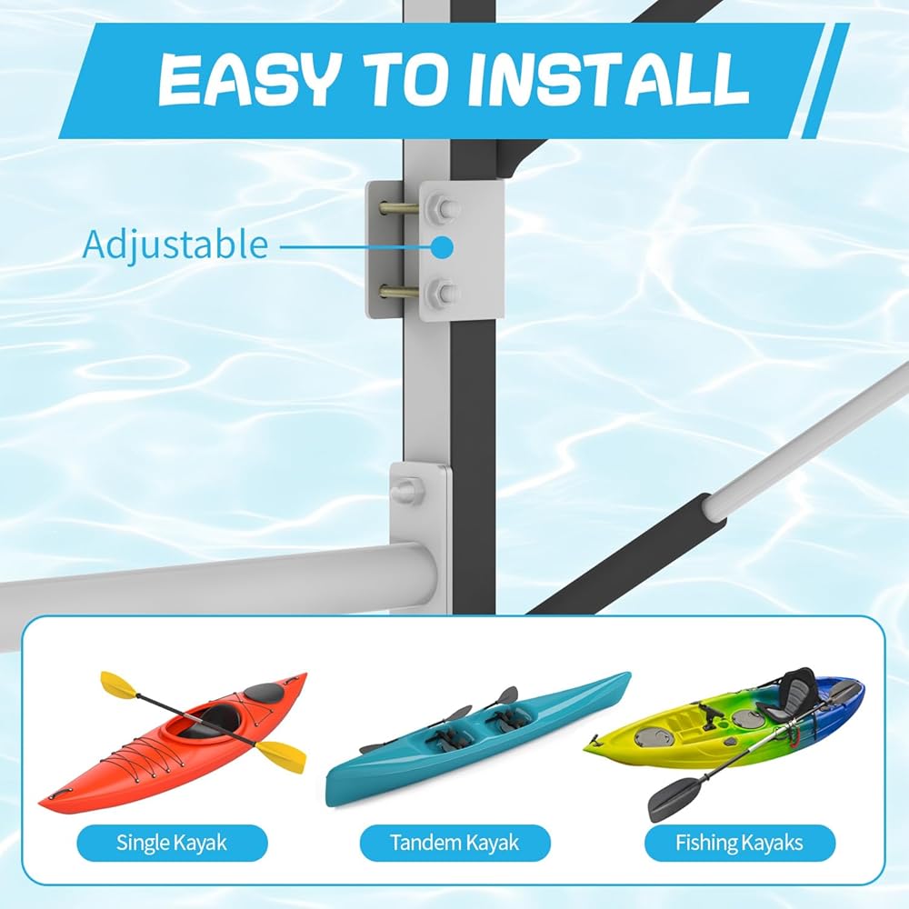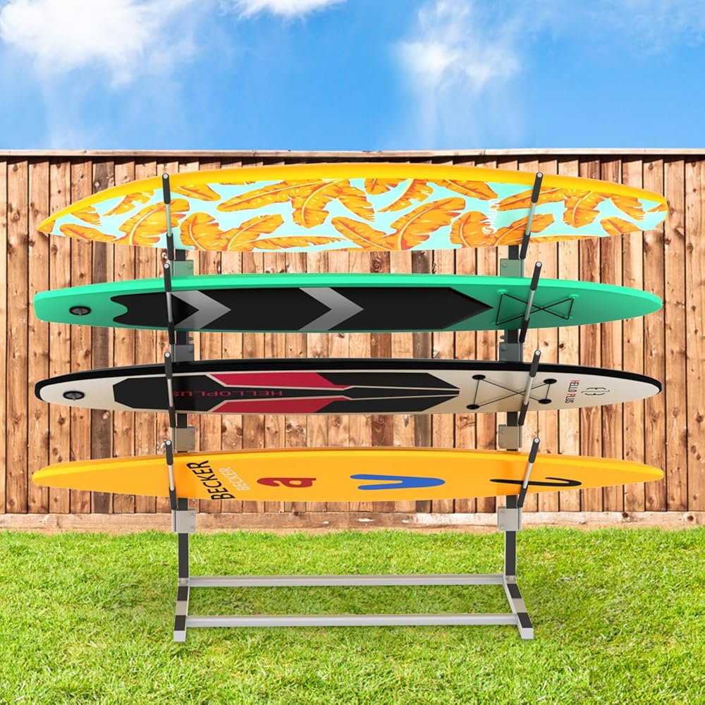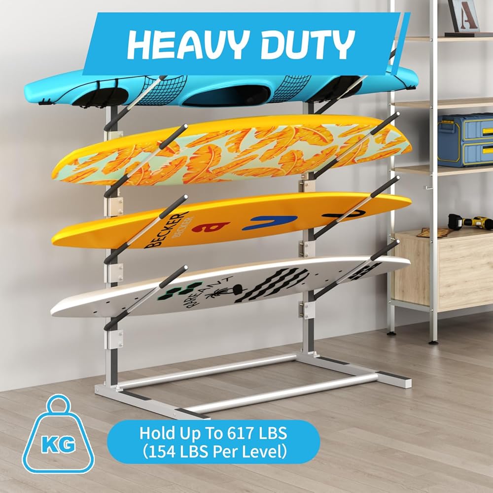 4 أذرع دعم قابلة للتعديل: يوفر رف التخزين القائم بذاته مساحة كبيرة لتخزين معدات الرياضات المائية الخاصة بك. يمكنك تخصيص المسافة لاستيعاب الألواح ذات الأحجام والأشكال المختلفة. قم بتنظيم ما يصل إلى 3-4 قوارب الكاياك وألواح التجديف وألواح ركوب الأمواج والزوارق
