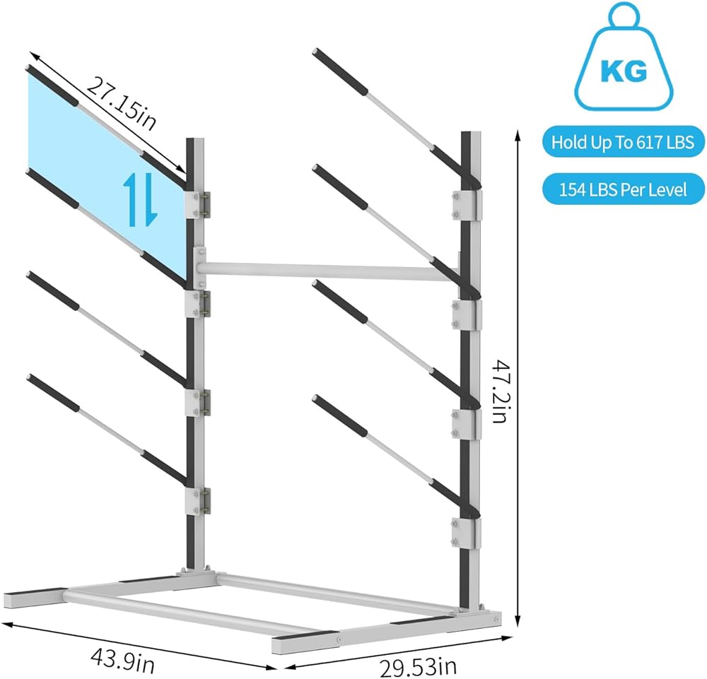 شديدة التحمل: رف الكاياك مصنوع من معدن قوي ويمكنه تحمل 154 رطلاً لكل طبقة وله سعة تحميل إجمالية تصل إلى 617 رطلاً، مما يوفر دعمًا قويًا لمعدات المياه الخاصة بك. للحصول على أفضل النتائج، نوصي بوضع الحامل على أرض مسطحة ومستوية وتجنب الأسطح الرملية أو المنحدرة أو غير المستوية