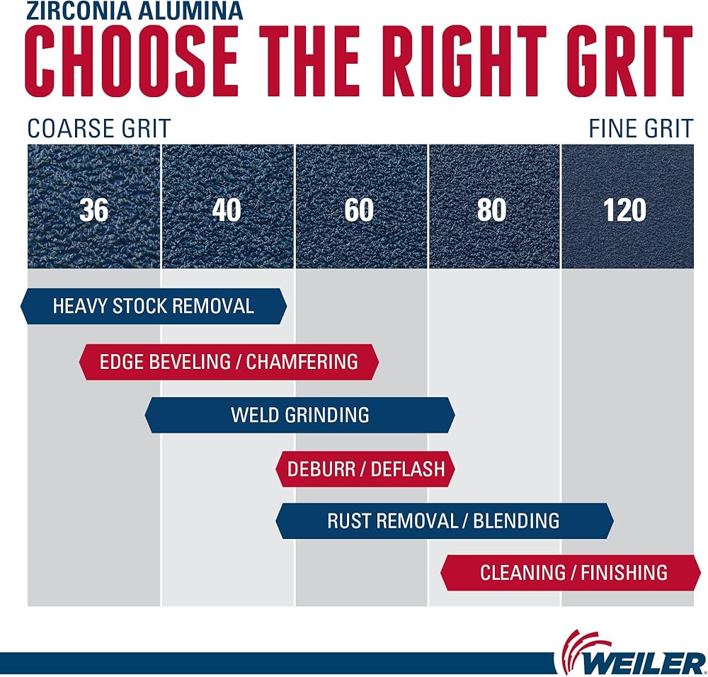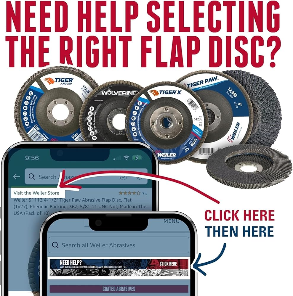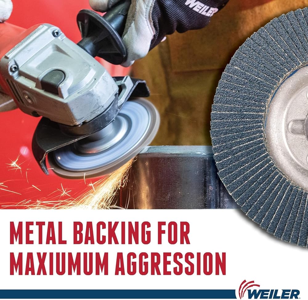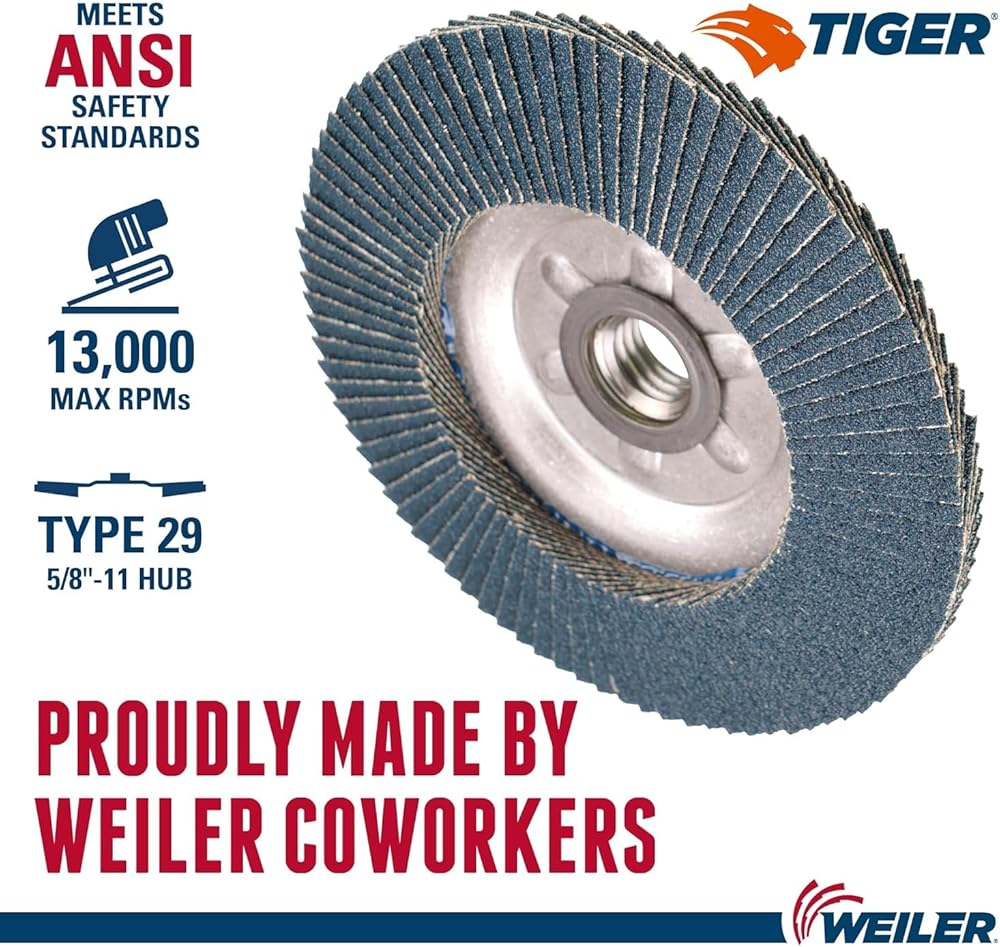 The Weiler Tiger type 29 angled-style zirconia alumina abrasive flap disc has an aluminum backing for rigid reinforcement and a threaded hole for attachment to grinding tools, and works well on curved surfaces. The zirconia alumina abrasive is self-sharpening and more durable than aluminum oxide, which makes it suitable for fast material removal rates and aggressive grinding. Applications include weld blending, deburring, deflashing, edge chamfering, stock removal, and grinding and finishing in one step. The disc has an angled shape for maximum workpiece contact and is commonly used with right-angle grinders at a 15- to 35-degree angle to dissipate heat. Threaded hole fastening type indicates a disc with a female-threaded central hole that twists onto a threaded arbor. Abrasive flap discs are made from overlapping pieces of coated abrasive attached to a hub. They help reduce finishing time and cost by grinding and finishing in the same step, such as when removing a weld bead and smoothing the workpiece around the weld. Flap discs are coated, meaning an adhesive is used to attach the abrasive grains to a backing of paper, plastic, or cloth. The action of a flap disc is much like that of a sanding disc: the grinding or polishing occurs on the face of the disc. They are used for a variety of applications from shaping a part to fine finishing, depending on the grit size. Low grit numbers like 40 are coarse (with fewer, larger grains) and remove excess material and shape parts. High grit numbers like 400 are fine (with more, smaller grains) and help create a smooth surface finish. Weiler manufactures precision brushes, abrasives, and maintenance products. The company was founded in 1898 in Germany, is headquartered in Cresco, PA, and is International Organization for Standardization (ISO) 9001 certified.