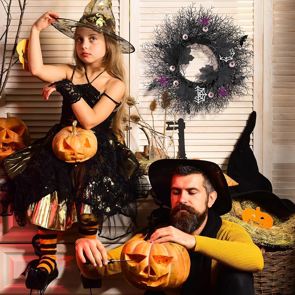 إكليل عيد الهالوين المصنوع يدويًا - مصنوع يدويًا من أغصان وفروع سوداء ملتوية، ويتميز إكليل الهالوين المخيف للباب الأمامي بزخارف غريبة مثل العناكب الأرجوانية اللامعة والخفافيش وأوراق القيقب السوداء ومقل العيون المحتقنة بالدم للحصول على مظهر مقلق. (سقوط بعض علامات الغراء أو التركيبات أمر طبيعي.)