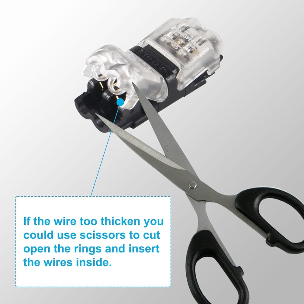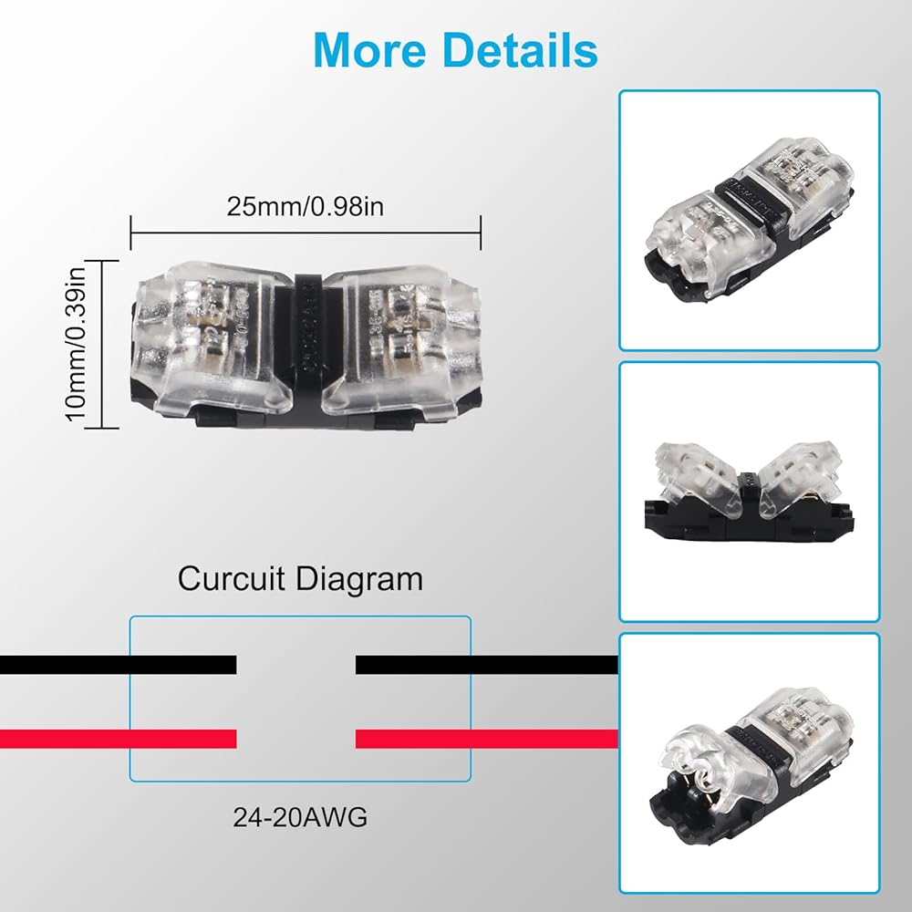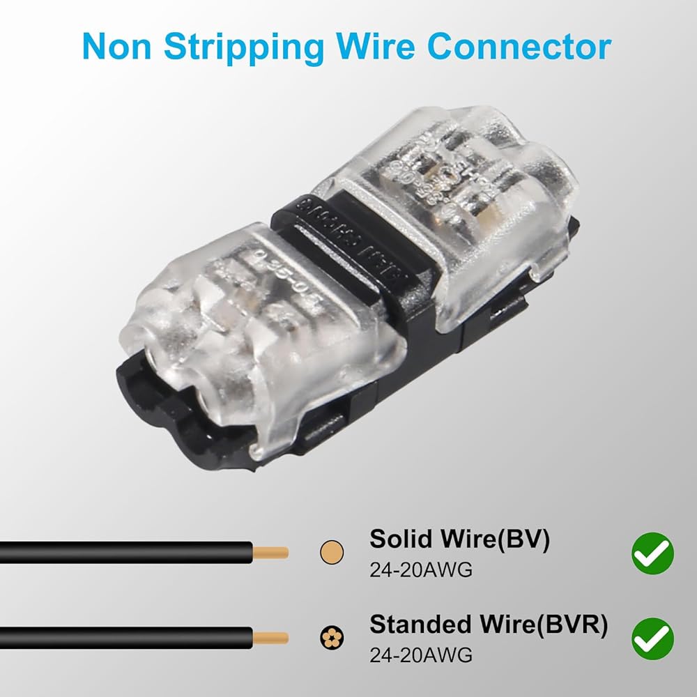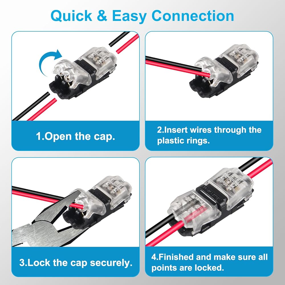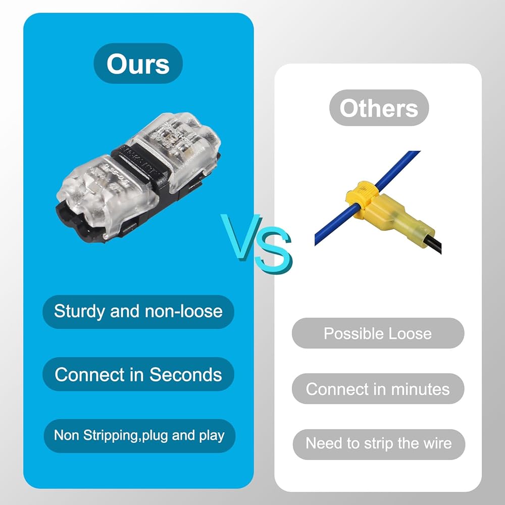 QUICK WIRE CONNECTORS: No wire stripping is necessary, as the electrical connectors feature an innovative clasp connection design, eliminating the hassle of stripping, bending and welding. Simply snap the wires into these connectors – a straightforward and easy process. This not only saves your time, but also minimizes any errors that can result from complex assembly procedures.