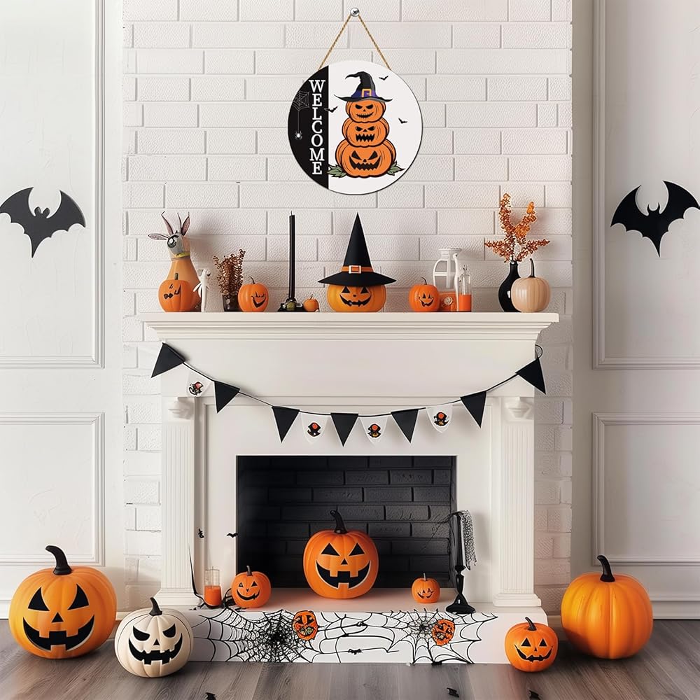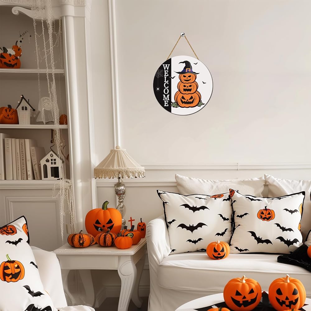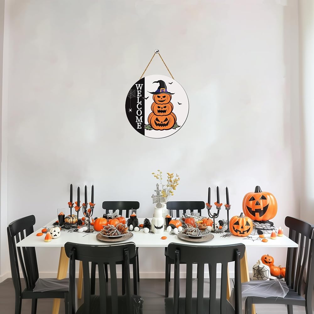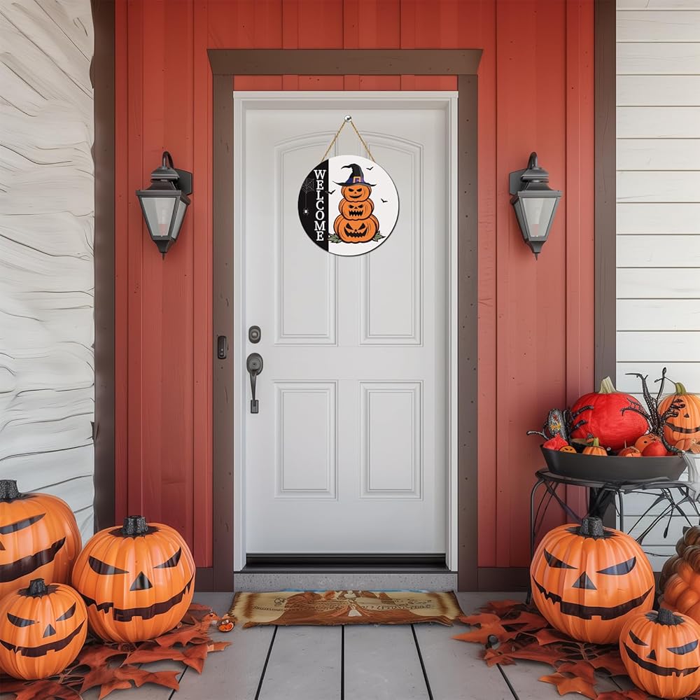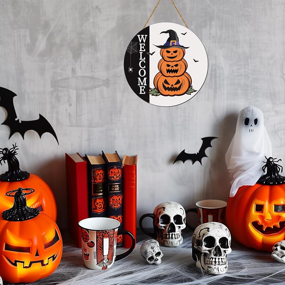 زينة باب الهالوين، علامة ترحيب للهالوين، شماعة باب، مخيفة للهالوين، لافتة باب اليقطين الخشبية، إكليل باب الهالوين، ديكور معلق لجدار الباب الأمامي، جدار الشرفة، ديكور المنزل الداخلي للهالوين