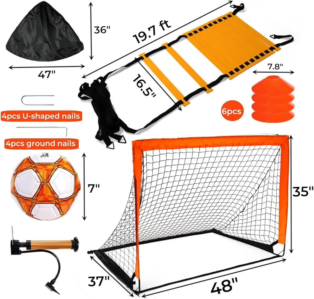 هدف كرة قدم محمول للفناء الخلفي، مجموعة معدات تدريب كرة القدم الشبكية مع كرة، سلم رشاقة بطول 19.7 قدم، حقائب حمل، مضخة، 8 أظافر أرضية، 4 أبازيم مثلثة للألعاب الرياضية الخارجية
