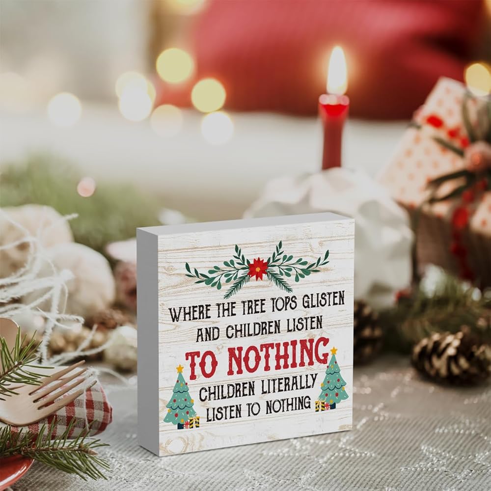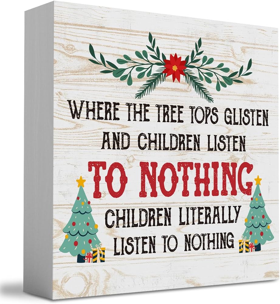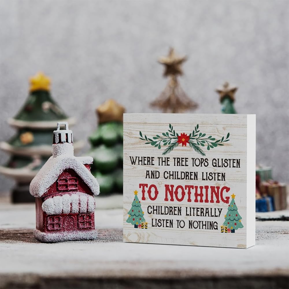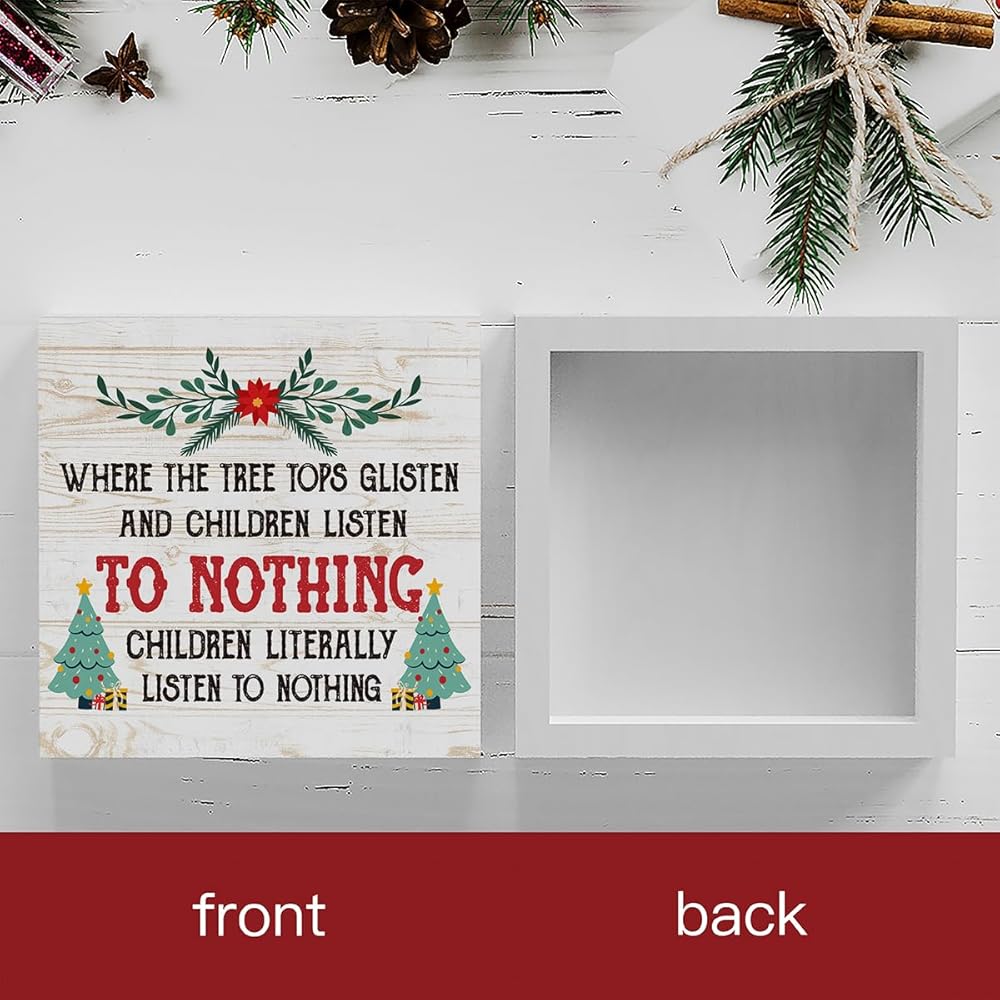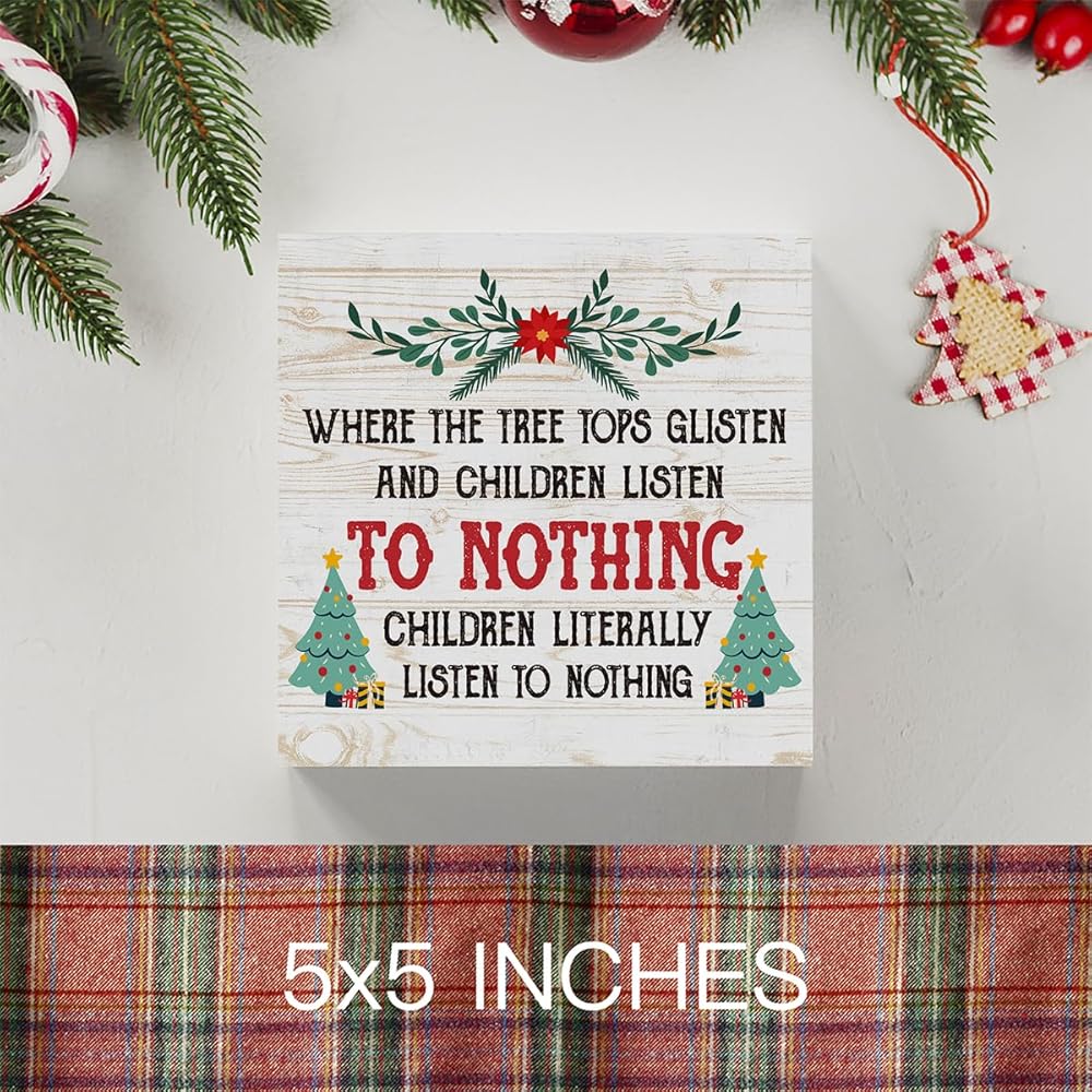 مضحك حيث قمم شجرة لامعة والأطفال يستمعون علامة صندوق خشبي، مزرعة عيد الميلاد سانتا ديكور العمل الفني، الخشب مربع علامة مكتب كتلة علامات المنزل الجرف مكتب الديكور 5 × 5 بوصة